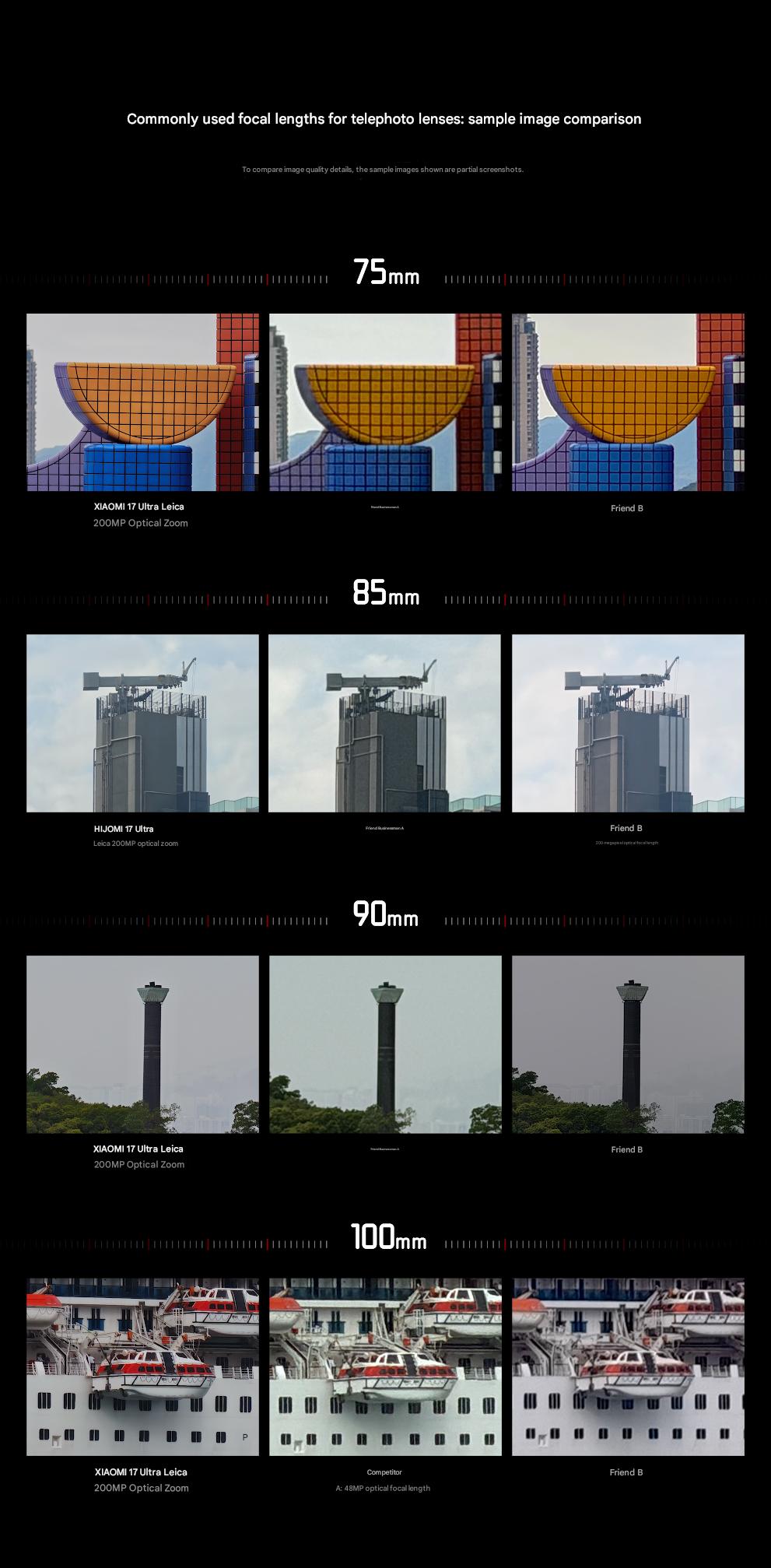 La marca ha compartido algunas tomas que muestran los detalles de captura en cada paso de la distancia focal. Estas tomas, que se adjuntan a continuación, también se comparan con las de dos teléfonos de la competencia sin nombre, y parece que el Xiaomi 17 Ultra lleva las de ganar. Junto a las tomas comparativas, la marca ha compartido algunas fotografías nocturnas de retratos.