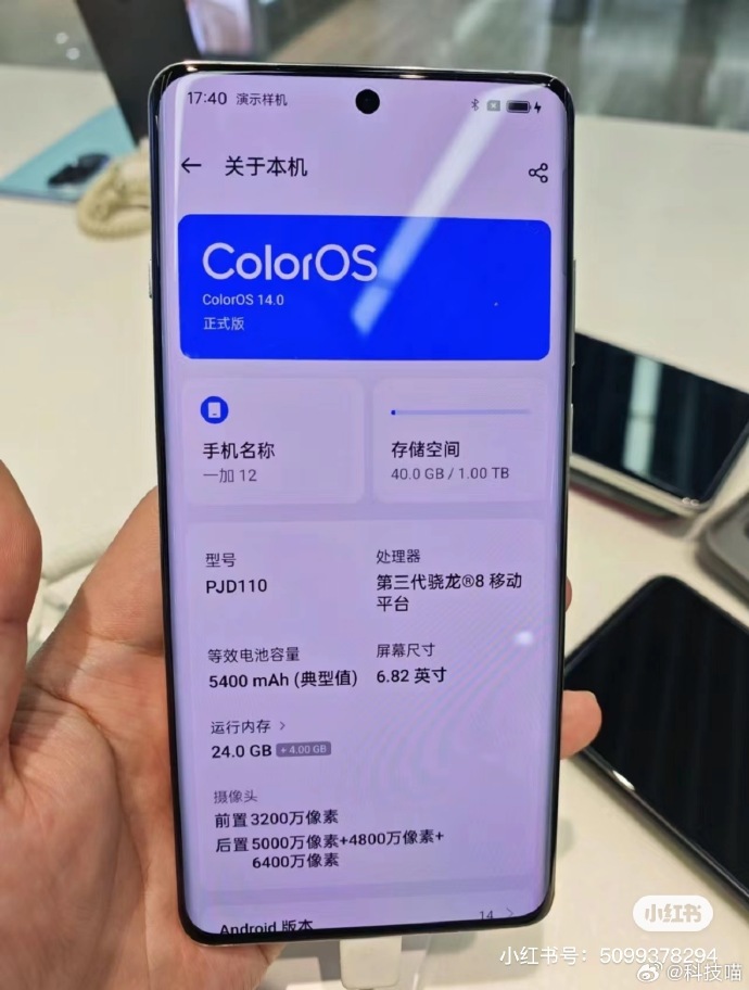 La imagen en vivo pretende confirmar que el panel es curvado y pertenece efectivamente a la versión china del OnePlus 12 (o PJD110), sobre todo porque parece ejecutar ColorOS 14. El Android 14-rOM basada ostensiblemente tiene una página de información del producto en su configuración que pone todas las especificaciones más pertinentes del 12 en 1 pantalla.