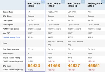 Por desgracia, aún no hay entrada oficial para el AMD Ryzen 9 7950X en PassMark, e incluso entonces el enfrentamiento entre el Intel Core i9-13900K y el procesador Zen 4 no es tan sencillo como parece a primera vista. Diferentes recuentos de núcleos (i9: 24; R9: 16), diferentes velocidades de reloj (i9: 3-5,8 GHz; R9: 4,5-5,7 GHz) y diferentes TDPs (i9: 125-253 W (base-PL2); R9: 170 W (por defecto)) tienen que mezclarse con arquitecturas totalmente diferentes antes de que las puntuaciones puedan siquiera compararse. Sin embargo, el resultado del i9-13900K en un solo hilo comparado con el del mucho más antiguo Ryzen 9 5950X sí indica que se avecina una fantástica lucha.
