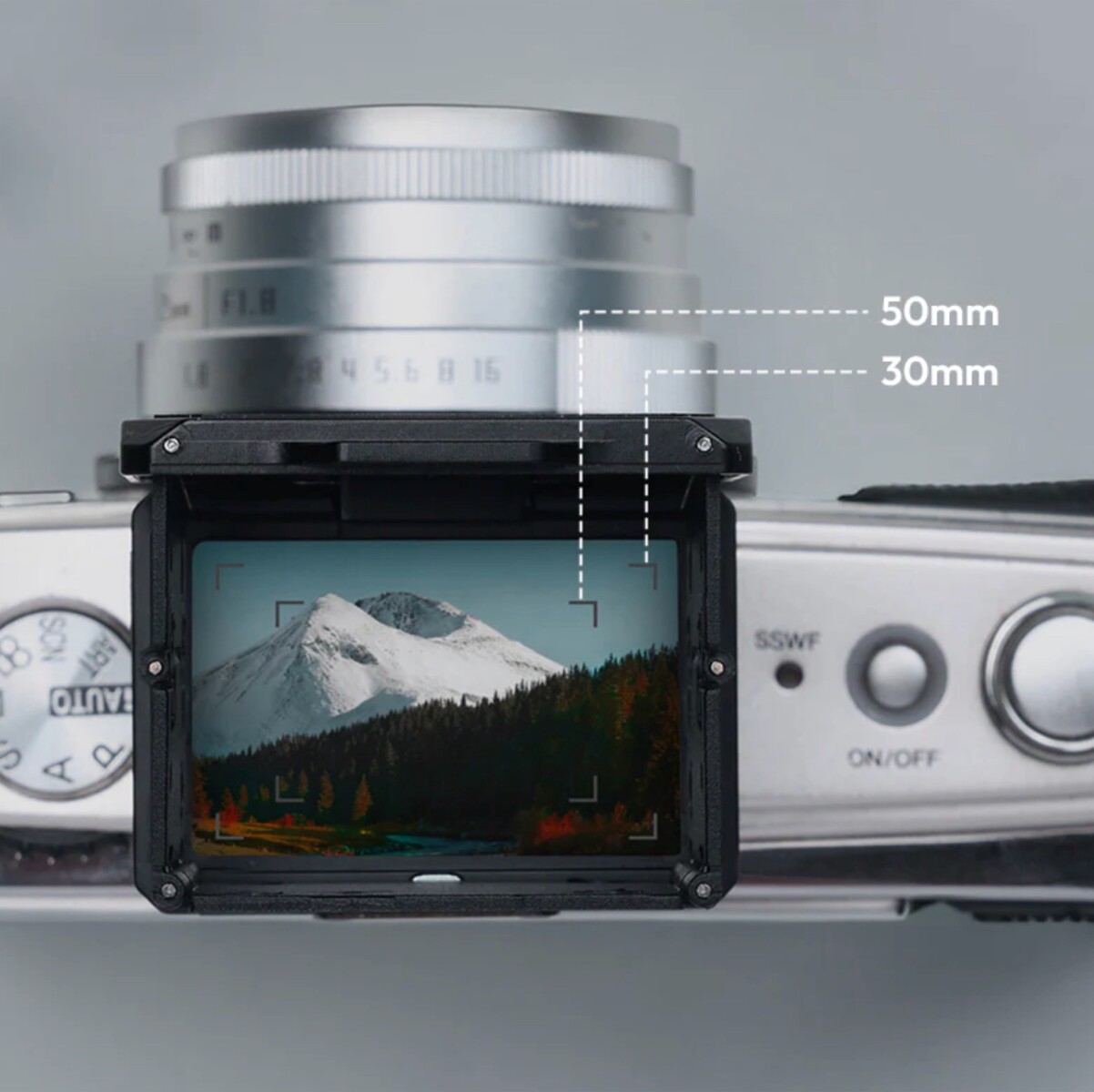 El Ulanzi VF-01 es un visor óptico que se acopla a la zapata de la cámara y le permite mirar hacia abajo para componer la toma. Un espejo y tres lentes muestran el campo de visión de un objetivo de 28 mm, pero las líneas de encuadre también le permiten ver el campo de visión de un objetivo de 35 mm o 50 mm.