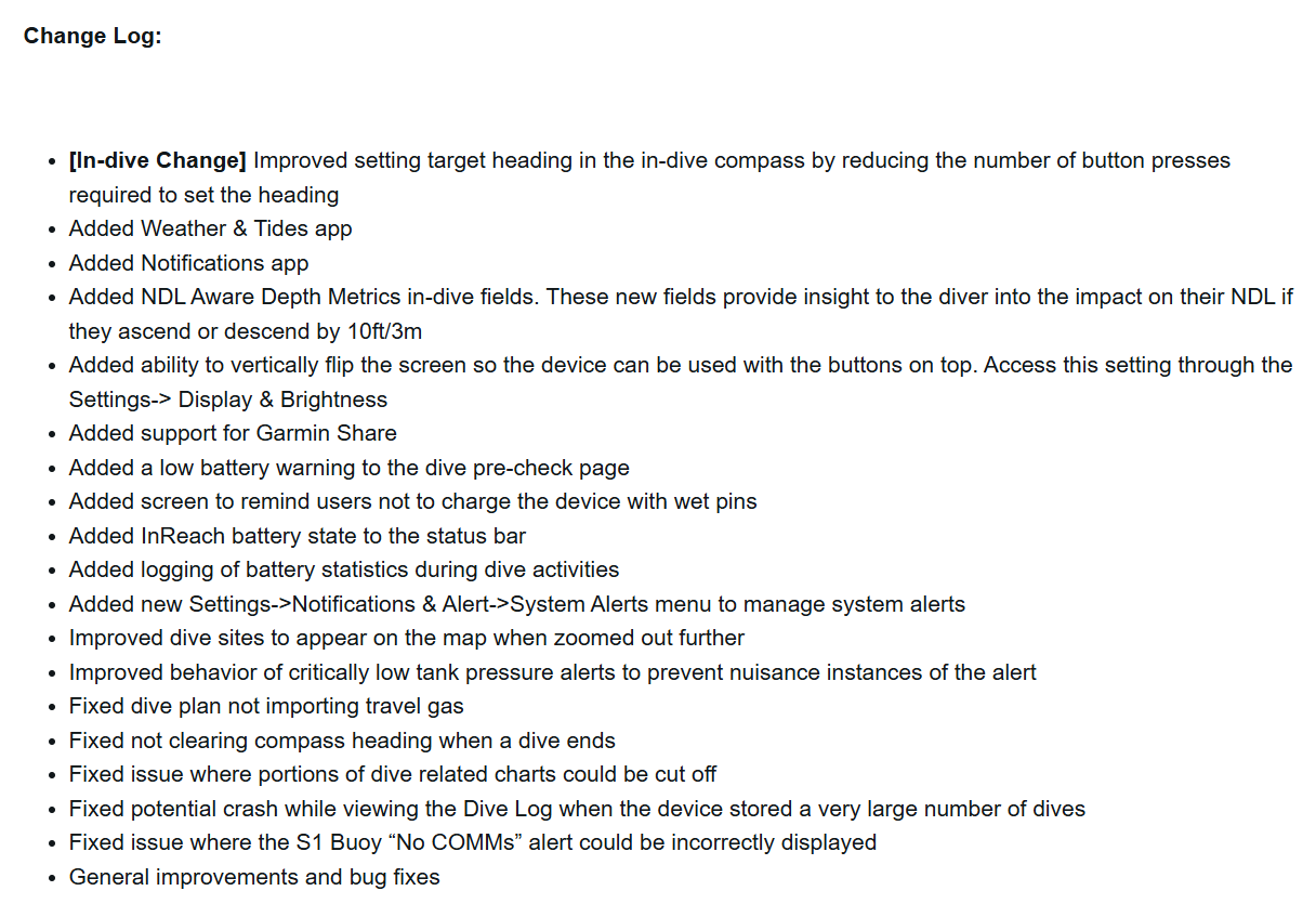 Las últimas actualizaciones añaden las aplicaciones Tiempo y Mareas y Notificaciones a este wearable. El dispositivo es ahora compatible con Garmin Share, y los usuarios pueden voltear la pantalla verticalmente, lo que les permite cambiar la posición de los botones de control a la parte superior en lugar de a la inferior. Los nuevos campos de métricas de profundidad NDL Aware en inmersión proporcionan a los buceadores más información, y también pueden recibir avisos de batería baja en la lista de comprobación previa a la inmersión. Además, el nivel de batería de un dispositivo inReach conectado puede mostrarse en la barra de estado, y las estadísticas de batería pueden registrarse como parte de una actividad de buceo.