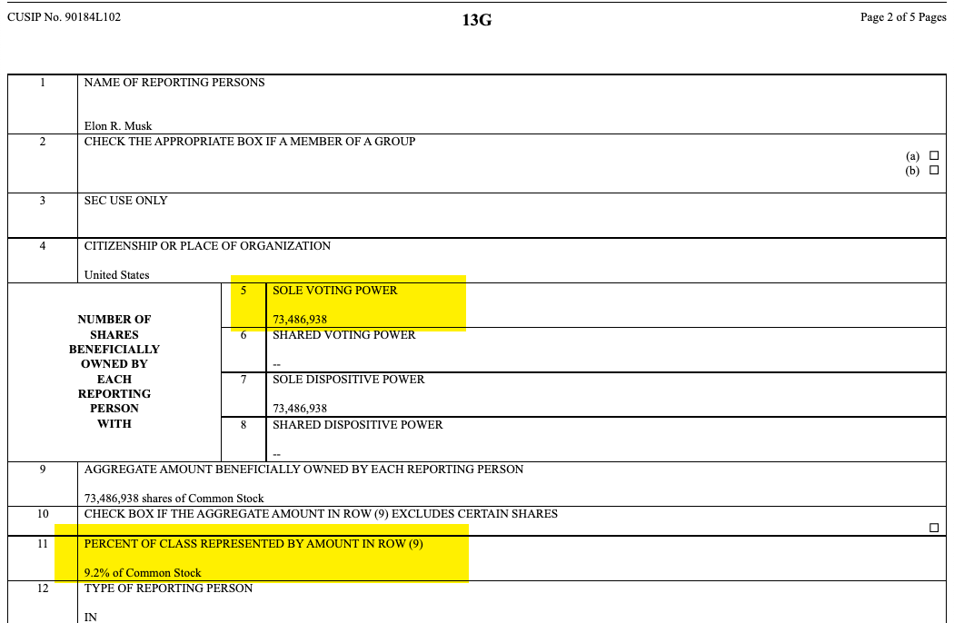 Unos días después de que Elon Musk insinuara que "se necesita una nueva plataforma" sobre Twitter, una declaración de propiedad de acciones 13G de la SEC revela que el CEO de Tesla ha adquirido el 9,2% de Twitter. A través de su fideicomiso, del que es el único propietario, Elon Musk ha comprado 73.486.938 acciones de Twitter, que al cierre del viernes representan una participación de casi 2.900 millones de dólares. Después de que la SEC publicara la información, las acciones de Twitter se dispararon en las operaciones previas al mercado y las acciones de Elon Musk podrían valer más de tres mil quinientos millones de dólares en este momento.