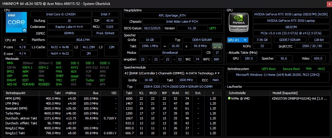 | Acer Nitro V 15 ANV15-52-50S2 Intel Core i5-13420H ⎘ NVIDIA GeForce RTX 5050 Laptop ⎘ 16 GB Memoría, 1024 GB SSD | Precio de catálogo: 1049 EUR | 2.1 kg | 23.5 mm | 15.60" 1920x1080 141 PPI IPS | |