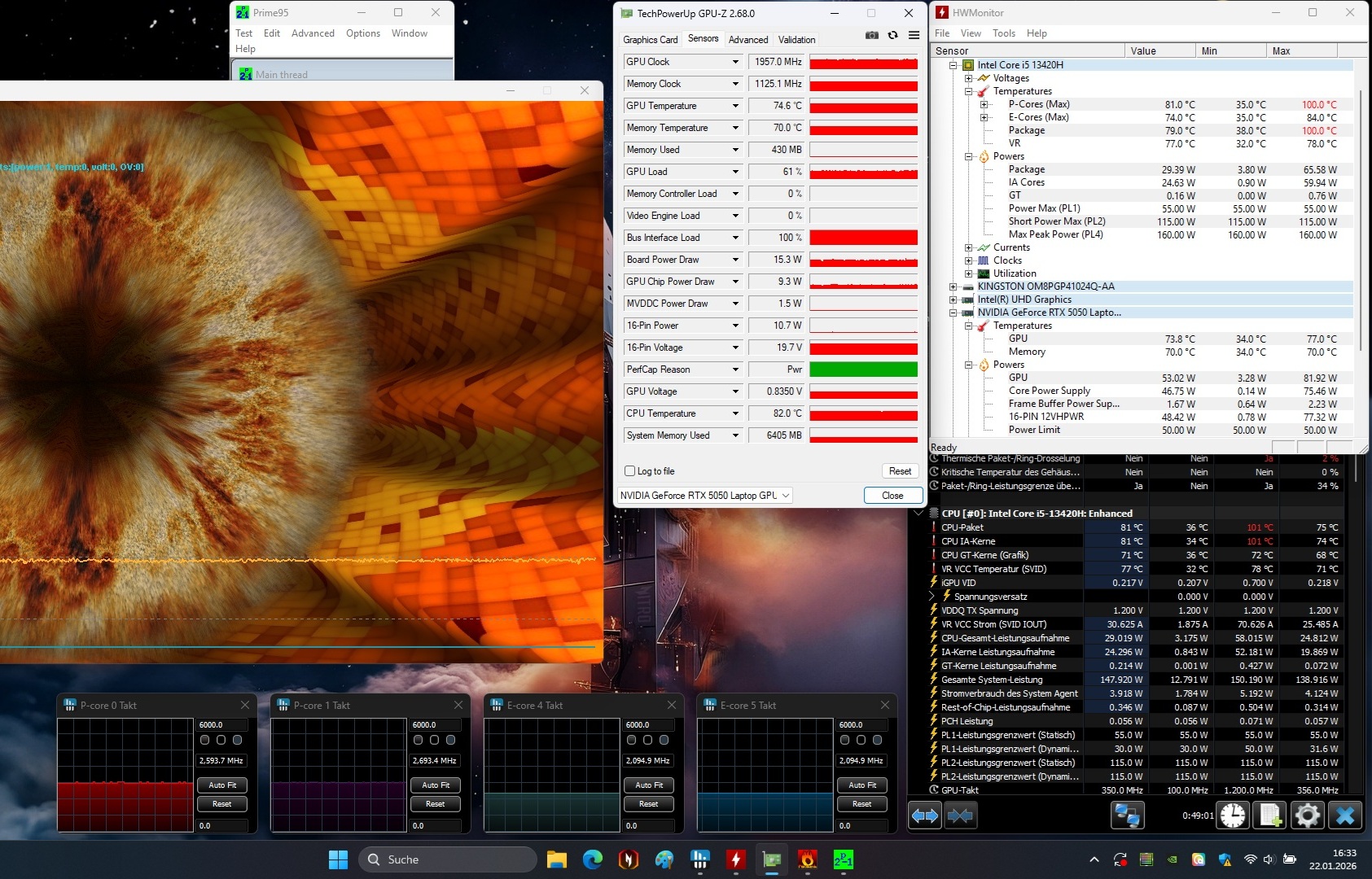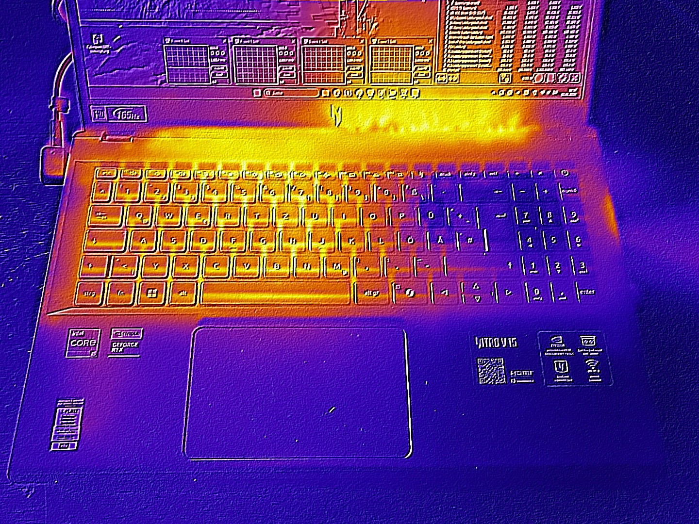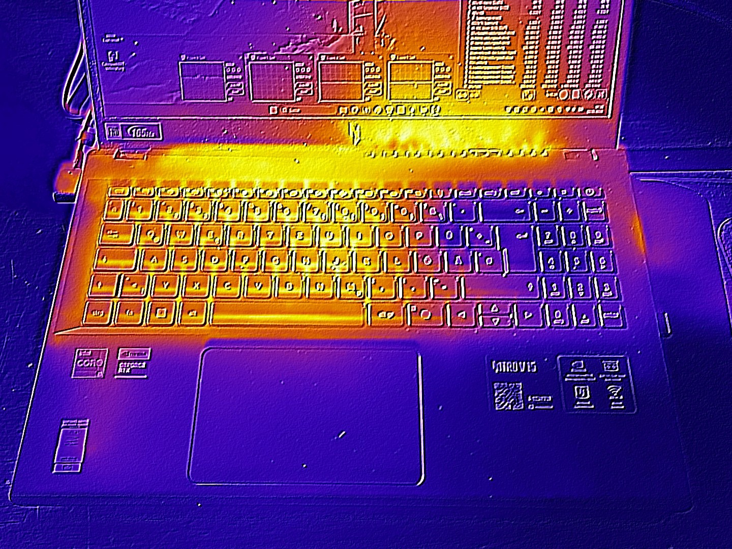 Las temperaturas están en línea con lo esperado para un portátil RTX 5050. En funcionamiento en reposo, el chasis se mantiene agradablemente frío.