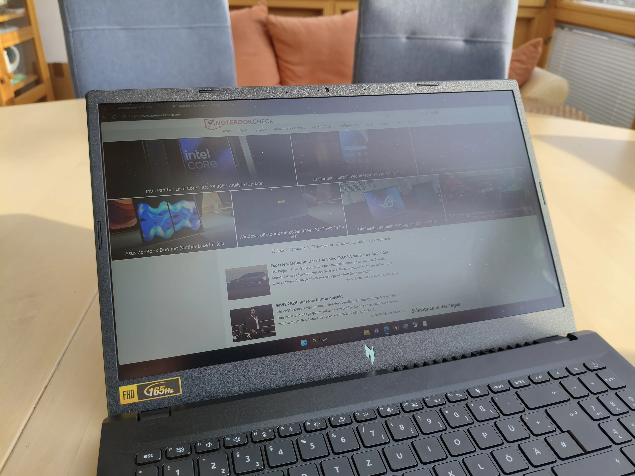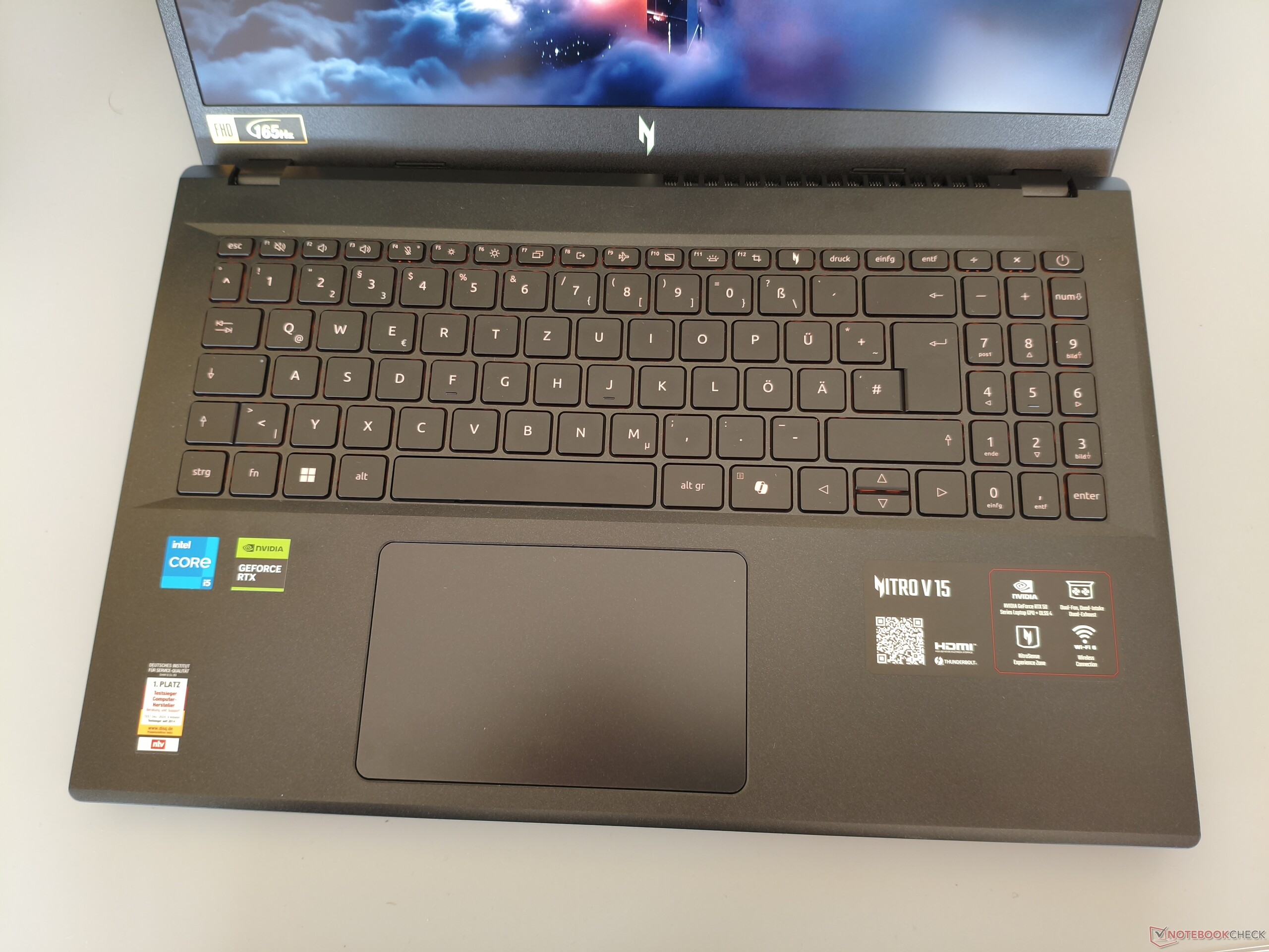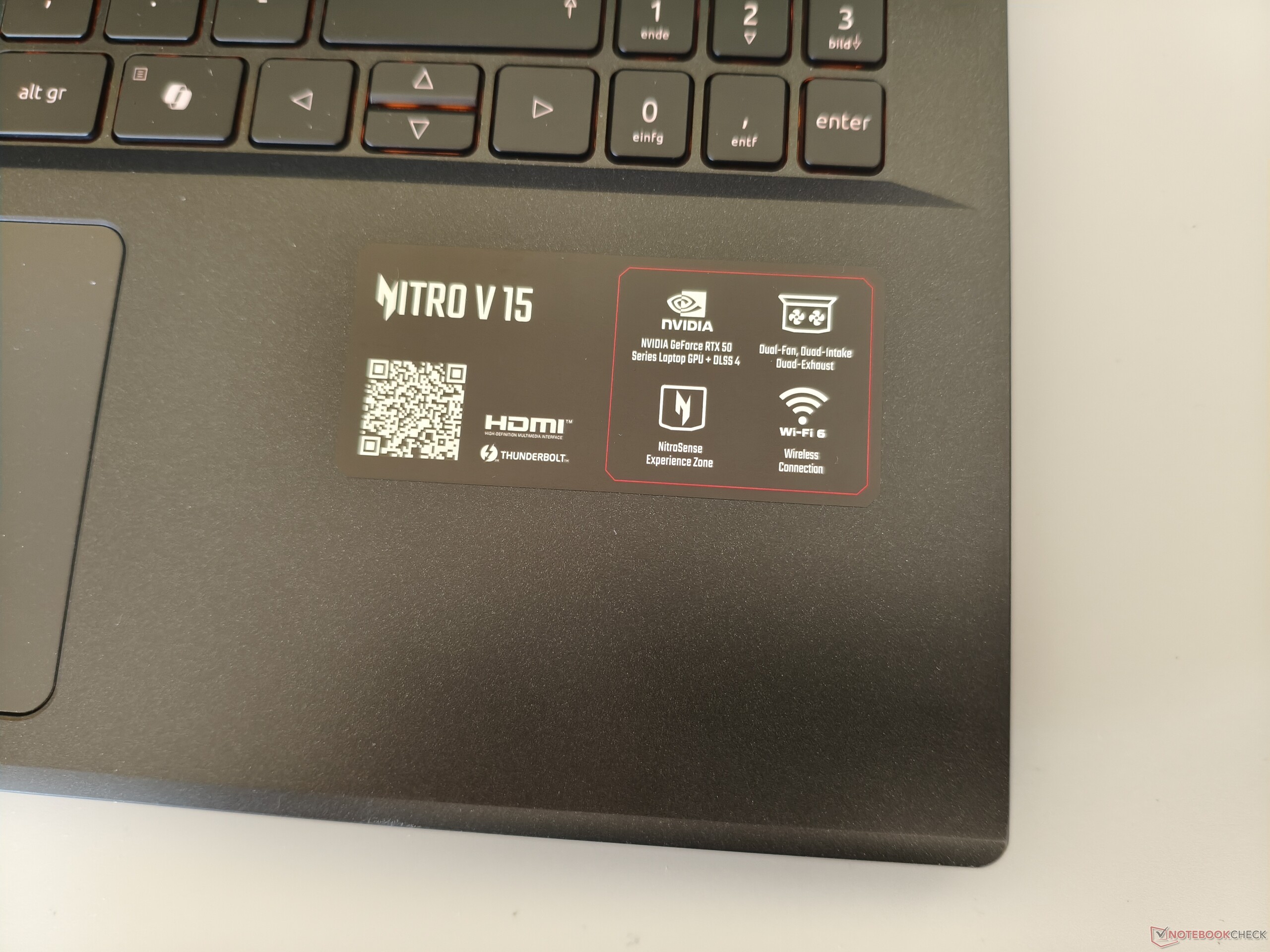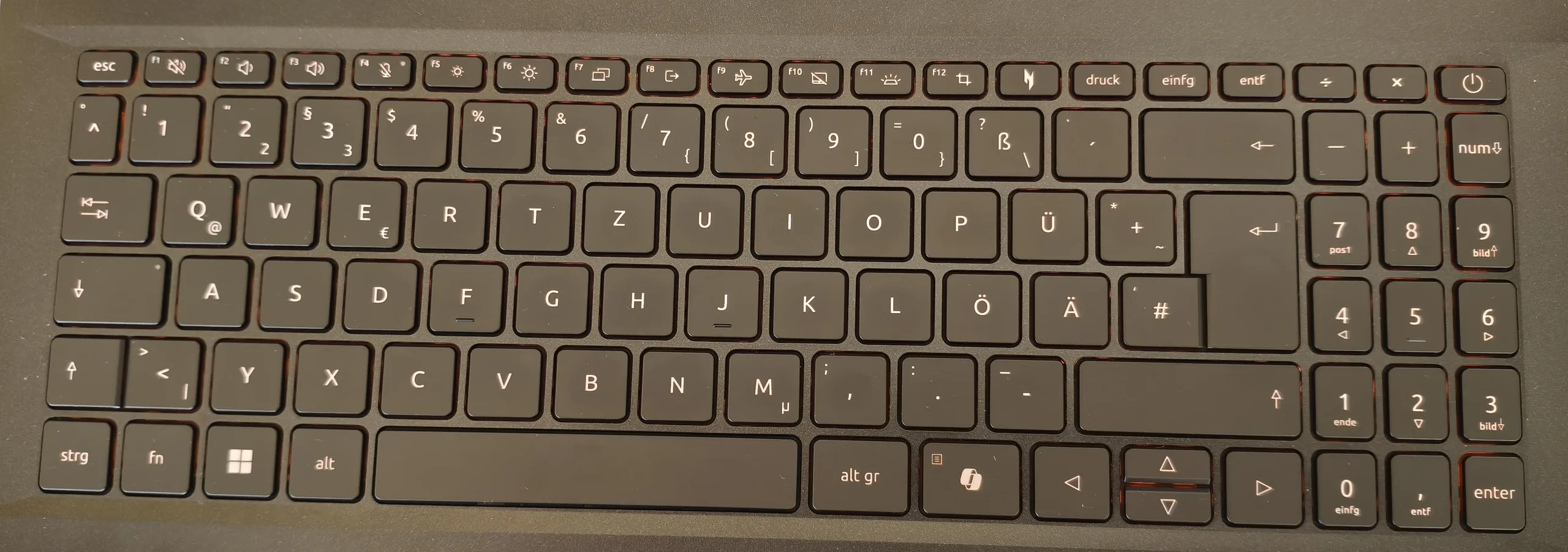 No quedamos del todo satisfechos con la disposición del teclado. Entre los puntos criticables se incluyen el teclado numérico de tres columnas en lugar de una disposición completa de cuatro columnas, así como las teclas de flecha centrales, más bien pequeñas. La experiencia de tecleo es la típica de cúpula de goma y, por tanto, nada especialmente destacable. También hay margen de mejora en lo que respecta a la retroiluminación. La iluminación naranja no es especialmente brillante, ni siquiera en su ajuste más alto. En el lado positivo, el portátil de 15 pulgadas cuenta con un touchpad bastante grande que mide 12,6 x 7,8 cm, aunque se siente algo traqueteante al pulsarlo.