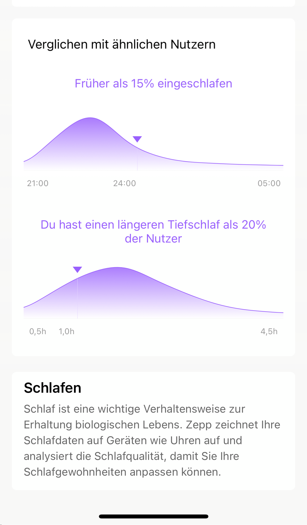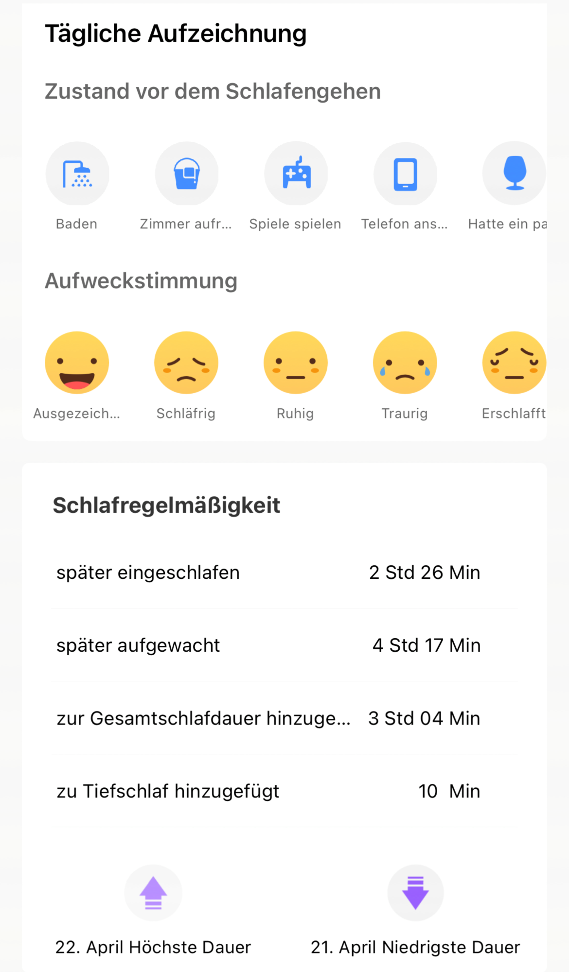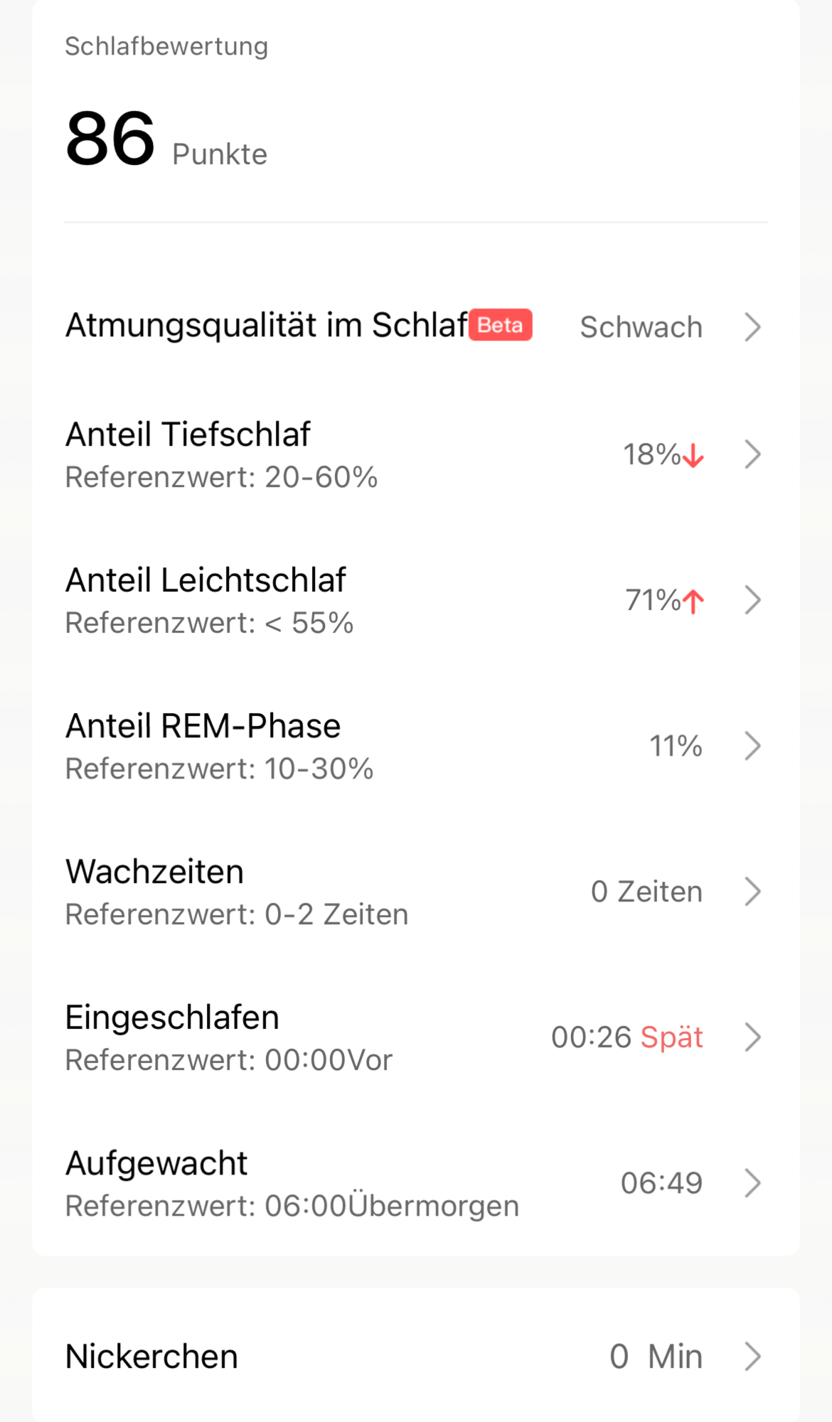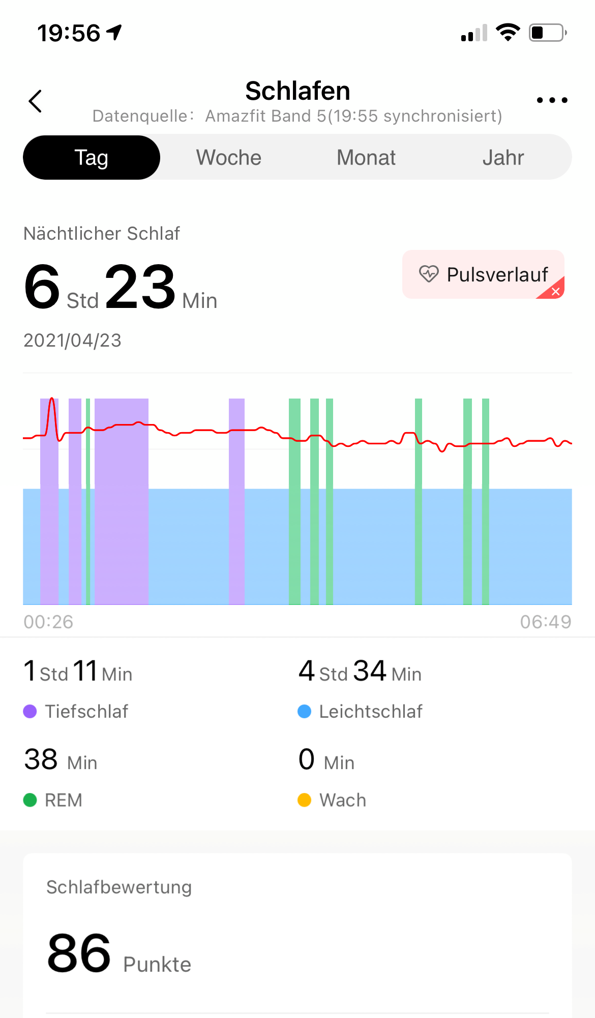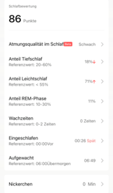 El rastreador Huami también registra la frecuencia cardíaca por la noche y la superpone a las fases de sueño registradas en el diagrama del registro del sueño. Sin embargo, la prueba reveló inconsistencias que ponen en duda la fiabilidad: El registro incluido aquí, por ejemplo, no refleja una breve fase de vigilia que se produjo durante la noche en cuestión