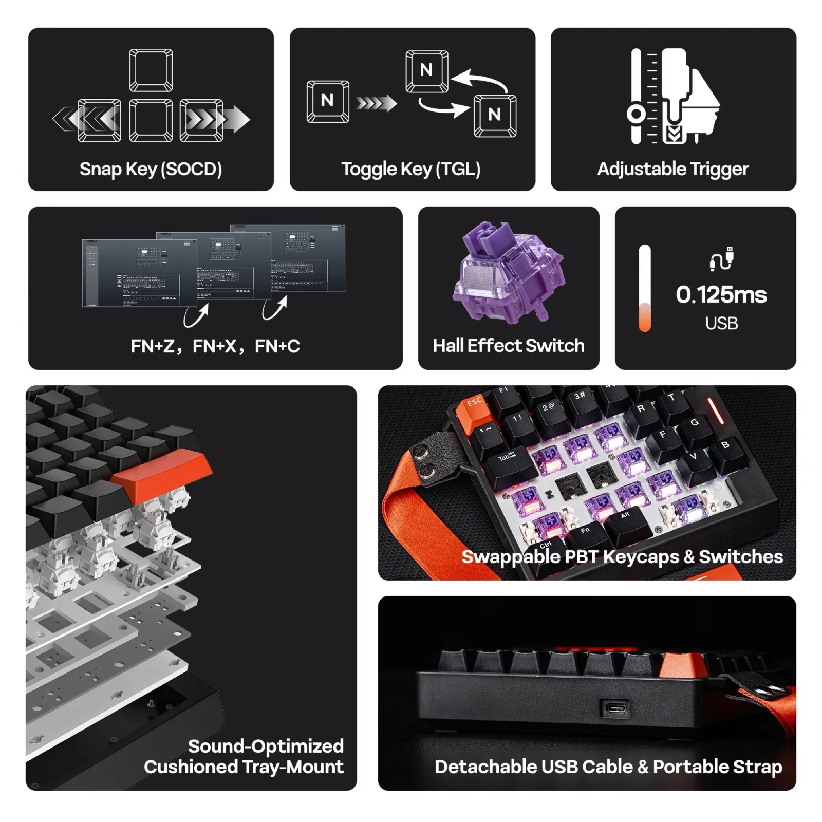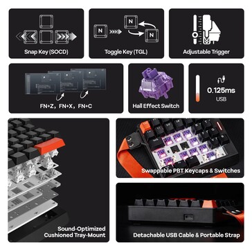 El teclado presenta una carcasa de plástico con una placa de aluminio para aumentar la estabilidad. Los interruptores de efecto Hall están diseñados para una respuesta especialmente rápida de las teclas, y el punto de activación también es ajustable. La retroiluminación RGB y las teclas PBT son estándar. El teclado de 350 gramos viene con una correa de muñeca para facilitar su transporte. Es compatible oficialmente con Windows y Linux, pero no con macOS.