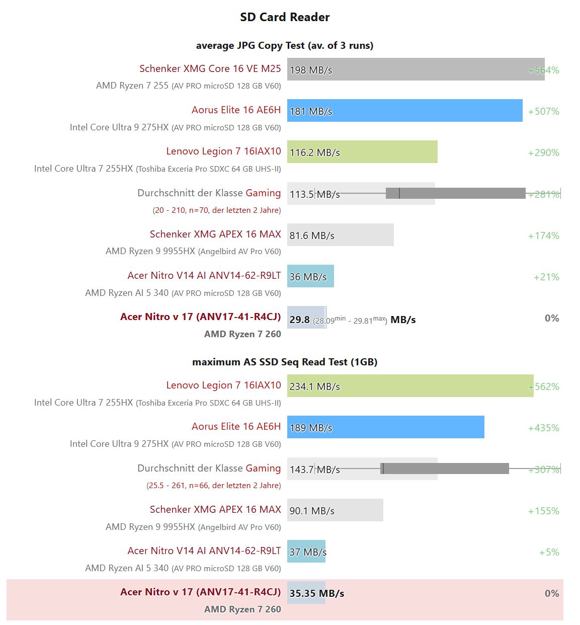 Dicho esto, vale la pena señalar que la mayoría de los portátiles que contribuyen a esa media son modelos significativamente más caros que incluyen lectores de tarjetas de mayor calidad. Naturalmente, esos dispositivos rinden mejor y empujan la media general hacia arriba.