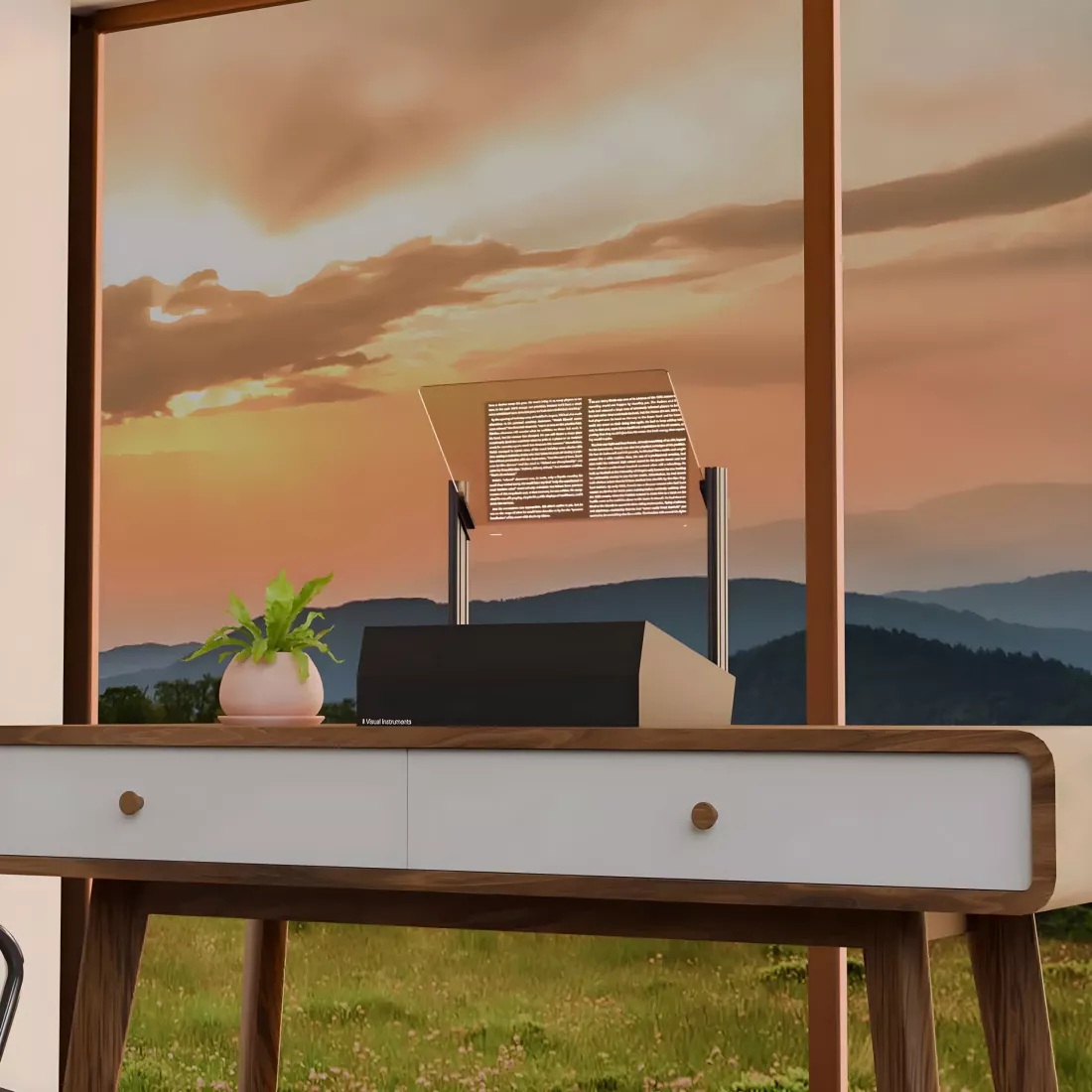 El truco aquí es que el usuario ve un reflejo de la imagen proyectada en el cristal, que permanece transparente. Esto crea la ilusión de que los gráficos flotan en el aire. Visual Instruments compara su diseño con las pantallas Head-up (HUD) que se encuentran en algunos vehículos modernos.