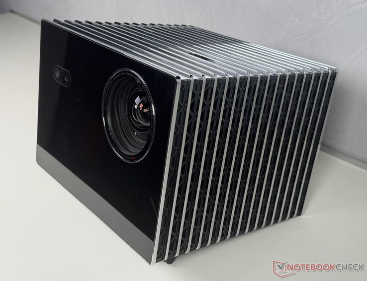 Incluso a primera vista, la Valerion VisionMaster Max es toda una declaración de intenciones. Con unas dimensiones de 25 x 25 x 20 cm y un peso de 7,5 kg, el aparato se suministra en una caja de polipiel y presenta un diseño elegante con una carcasa negra de alto brillo y lamas metálicas. Esto convierte al proyector en un objeto de diseño que no necesita esconderse ni siquiera en interiores elegantes.