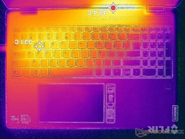 Las temperaturas superficiales son siempre más cálidas en la mitad izquierda del portátil que en la derecha debido a la posición de la solución de refrigeración en el interior. Cuando se ejecutan cargas exigentes, el punto caliente del teclado puede alcanzar los 33 C, comparable a lo que observamos en el modelo del año pasado. El competidor Galaxy Book3 Pro 360 16 o el Inspiron 16 7620 2 en 1 se calentarían aún más con más de 43 C cada uno bajo cargas pesadas similares. El modo Tablet del Lenovo nunca resulta incómodo de sostener.