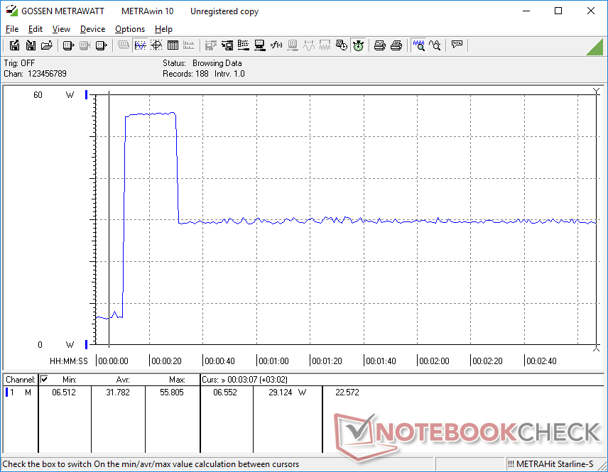 Hemos podido registrar un consumo máximo de 55,9 W del pequeño (~9,8 x 4,3 x 3,7 cm) adaptador de CA de 48 W cuando la CPU está al 100 por ciento de utilización. Esta tasa es sólo temporal, como muestran nuestros gráficos de abajo.