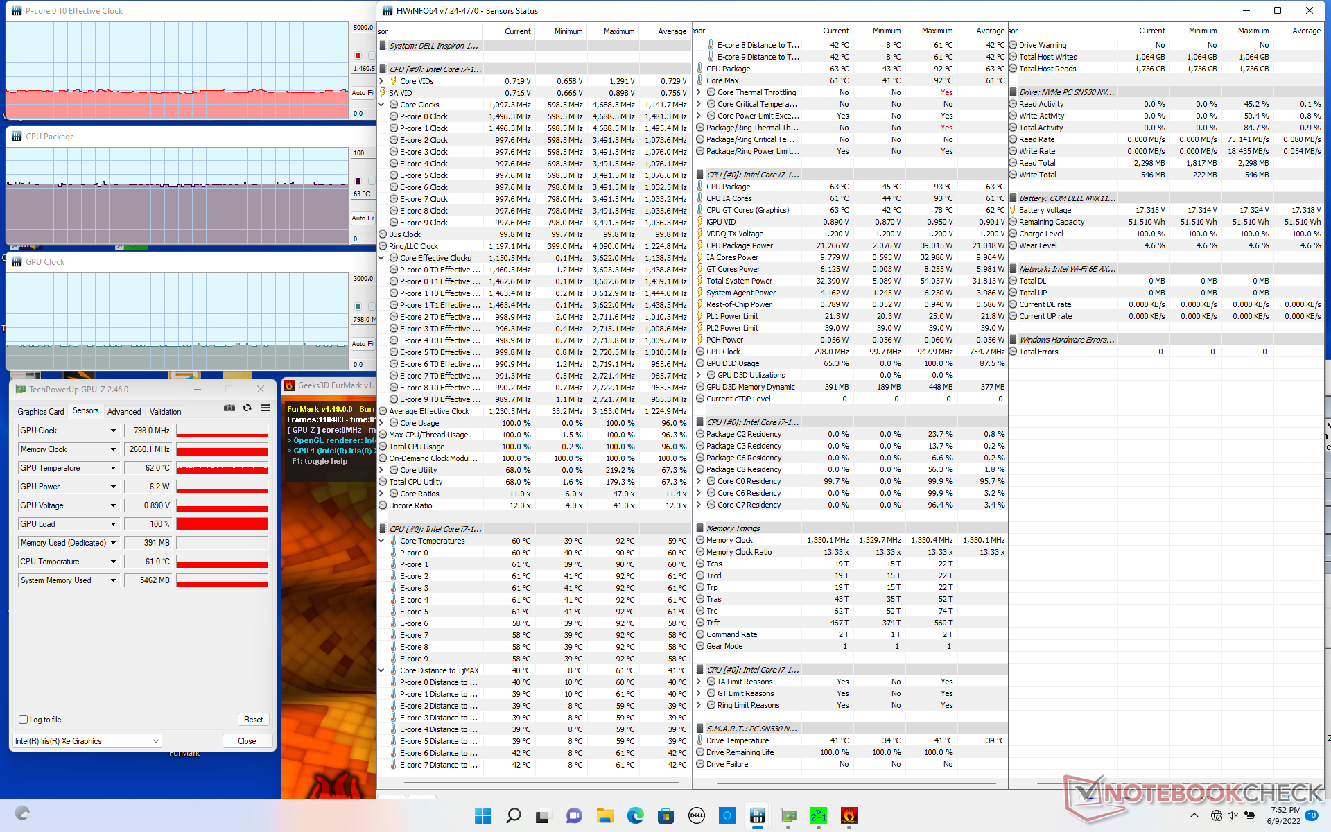 Cuando se estresa con Prime95, la CPU sube a 3,6 GHz durante los primeros segundos antes de alcanzar una temperatura del núcleo de 92 C. A partir de entonces, la velocidad de reloj baja y se estabiliza en 2,4 GHz para mantener una temperatura del núcleo más fría de 68 C. La potencia del paquete de la CPU llega a ser de 39 W durante el inicio de la prueba antes de estabilizarse en 23 W debido a las limitaciones térmicas. Es raro que cualquier subportátil convertible mantenga altas velocidades de reloj Turbo Boost durante periodos prolongados y el Inspiron no es diferente. Al ejecutar esta misma prueba en el LG Gram 14T90P con el más lento Core i5-1135G7 de 11ª generación, resultaría en una temperatura del núcleo ligeramente superior de 73 C, pero una potencia del paquete de la CPU inferior de 18 W.