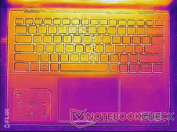 El centro del teclado y la placa inferior pueden alcanzar 38 C y 46 C, respectivamente, cuando se someten a aplicaciones exigentes durante más de una hora. Los resultados son similares a lo que observamos en el Dell Inspiron 14 7415 mientras que son más fríos en promedio que en el competidorAsus VivoBook Flip 14. Los reposamanos y los cuadrantes frontales del chasis, afortunadamente, nunca están incómodamente calientes sin importar la carga en pantalla.