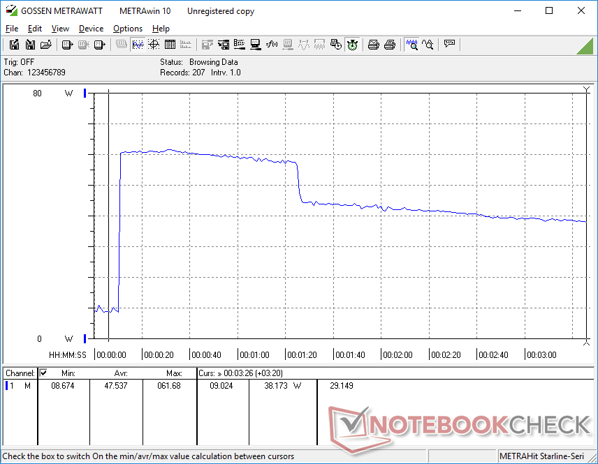 Pudimos registrar un consumo máximo de 63.6 W desde el pequeñísimo (~6.6 x 5.5 x 2.2 cm) adaptador USB-C AC de 60 W. Esta tasa es sólo temporal, como muestra la captura de pantalla de abajo, debido a las limitaciones térmicas de la solución de refrigeración de la CPU. El sistema seguirá recargando a una tasa decente cuando esté bajo un fuerte estrés de procesamiento.