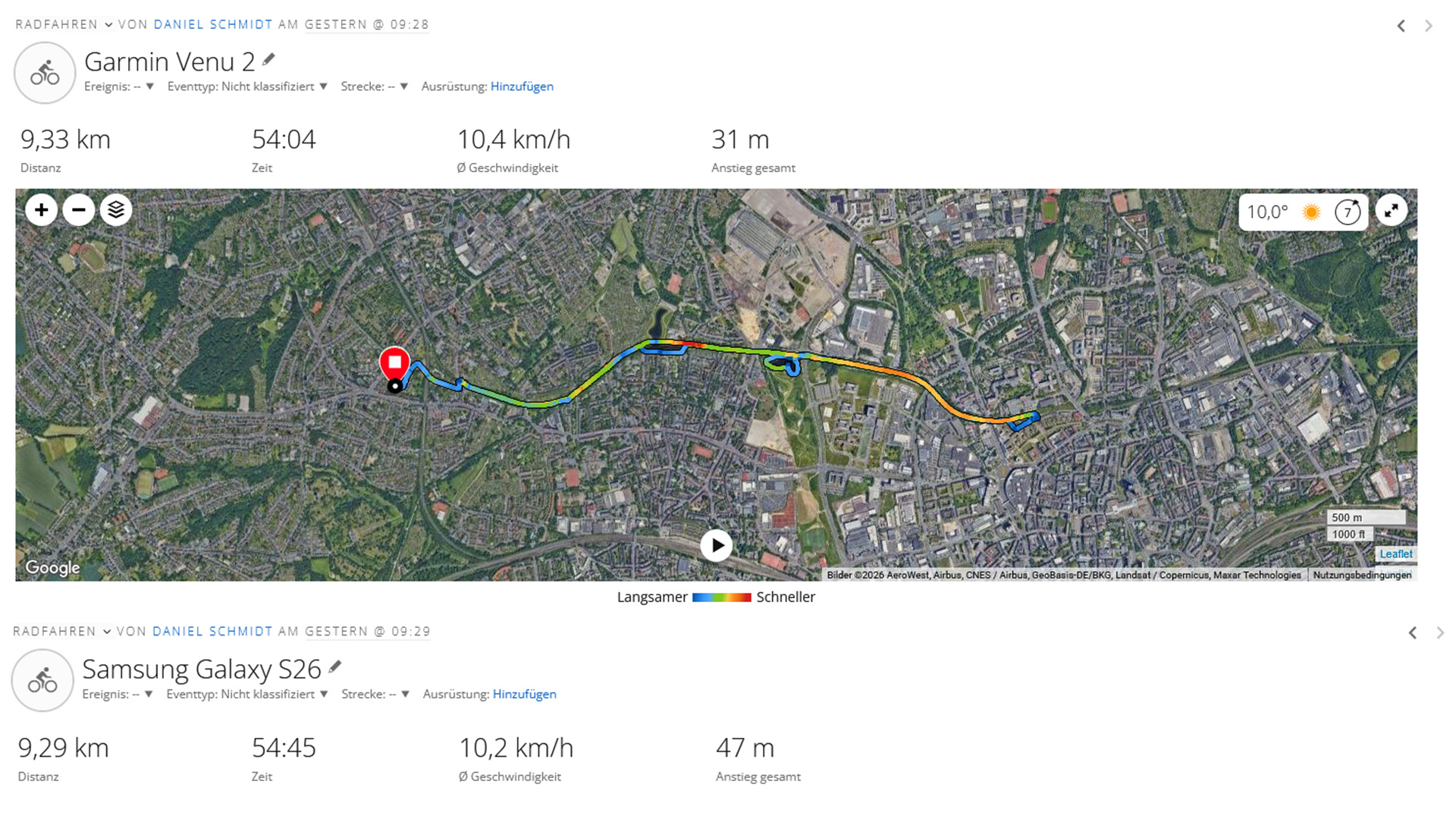 Durante un paseo en bicicleta, comparamos el smartphone de Samsung con el Garmin Venu 2, y resultó ser igual de preciso que el Modelo Ultra. Aunque fue algo menos preciso que el smartwatch en el lago, el S26 demostró mejores características de recepción entre edificios.