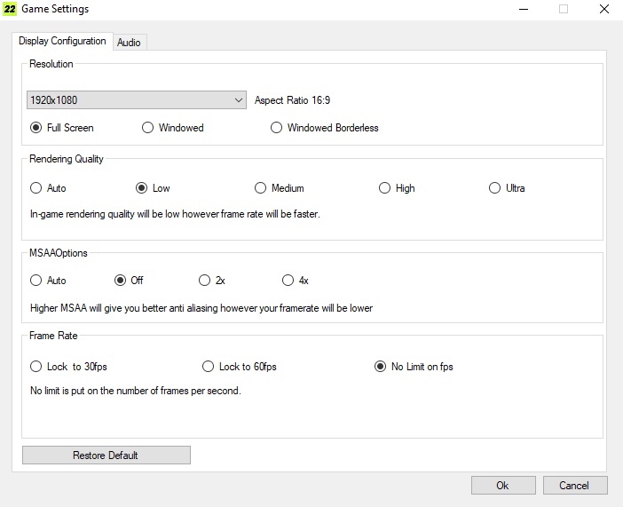 Los ajustes gráficos también son idénticos a los de su predecesor. Incluso fuera del juego, la resolución, la calidad de renderizado (de baja a ultra) y el suavizado de bordes (de 2x a 4x MSAA) pueden cambiarse en los ajustes del juego, más concretamente en el menú de Configuración de Pantalla. Además, hay un límite opcional de velocidad de fotogramas de 30 a 60 FPS