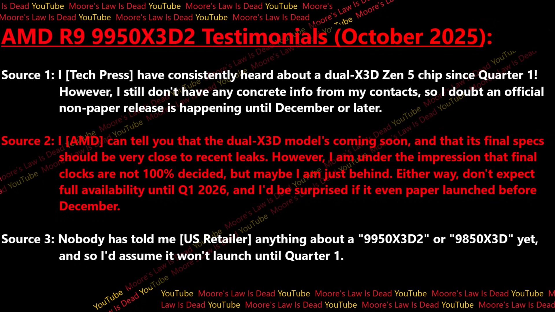 Transmitiendo la información de diferentes fuentes minoristas, AMD y "Tech Press", MLID informa de que no se espera que el lanzamiento propiamente dicho del Ryzen 9 9950X3D2 se produzca antes de diciembre. Una fuente de AMD afirmó que el Ryzen 9 9950X3D2 "llegará pronto", pero que la disponibilidad al por menor no se espera hasta el primer trimestre de 2026. Esta fuente también confirmó que las especificaciones generales filtradas anteriormente deberían estar "cerca de las especificaciones finales". Sin embargo, AMD podría introducir algunos cambios en las velocidades de reloj comunicadas.