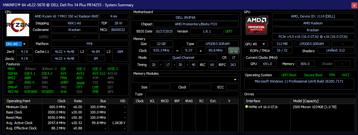 | Dell Pro 14 Plus PB14255 GH77W AMD Ryzen AI 7 PRO 350 ⎘ AMD Radeon 860M ⎘ 32 GB Memoría, 1024 GB SSD | Precio de catálogo: 1630 Euro | 1.6 kg | 22 mm | 14.00" 1920x1200 162 PPI IPS LED | |