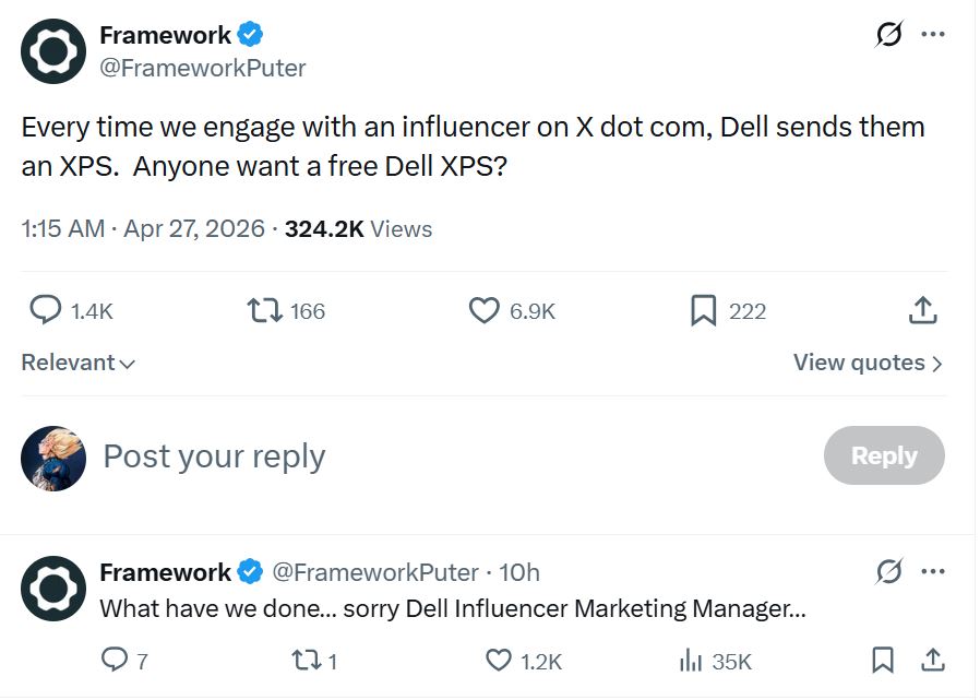 Naturalmente, los OEM de portátiles bien establecidos parecen estar tomando ahora en serio a Framework. Framework afirma que "cada vez que nos comprometemos con un influencer en X punto com, Dell le envía un XPS". El post ha ganado algo de tráfico decentecon más de 320.000 visitas en el momento de escribir este artículo. Esto ha provocado que mucha gente pida en broma a Framework que interactúe con ellos con la esperanza de conseguir una XPS de Dell.