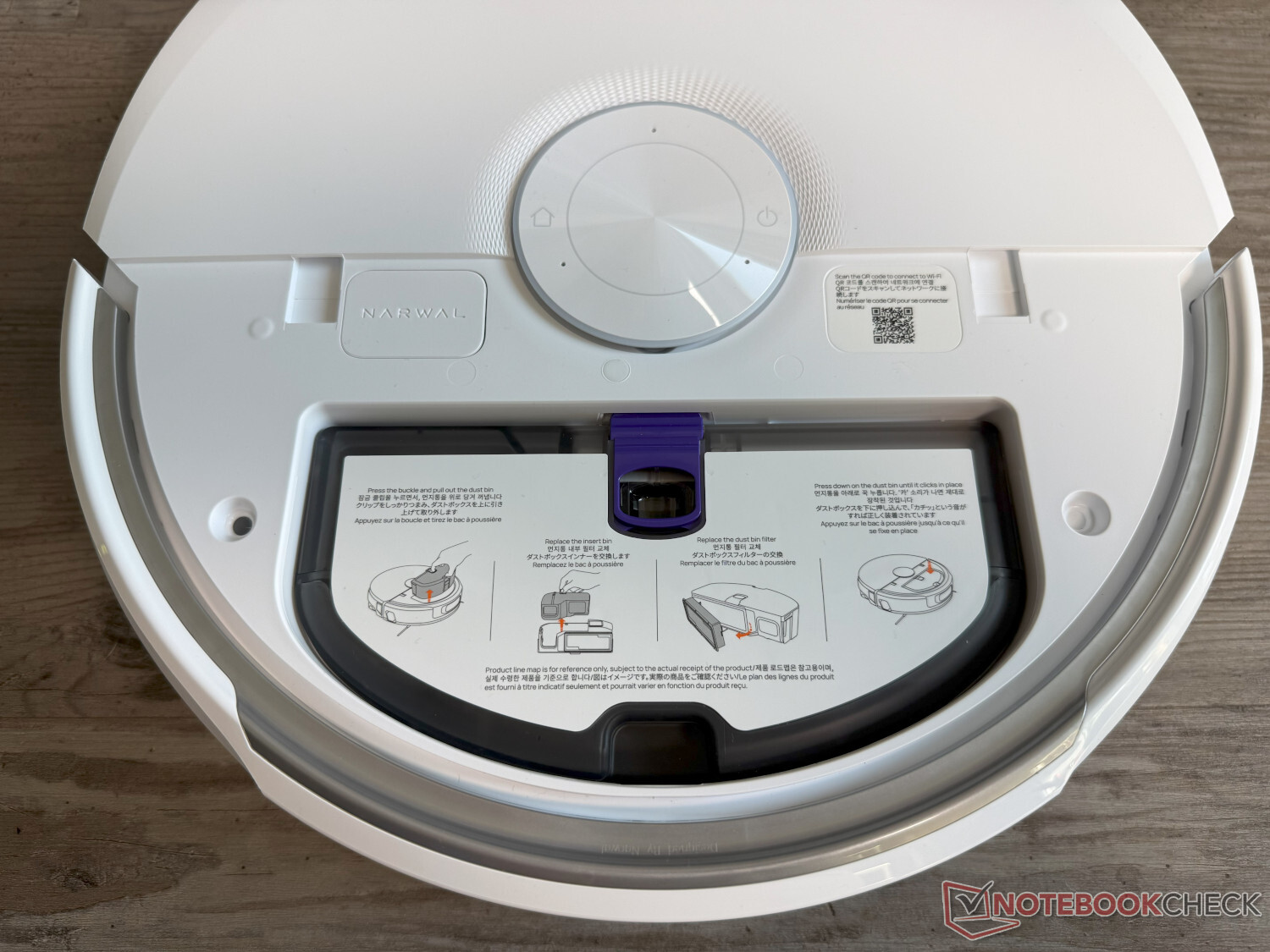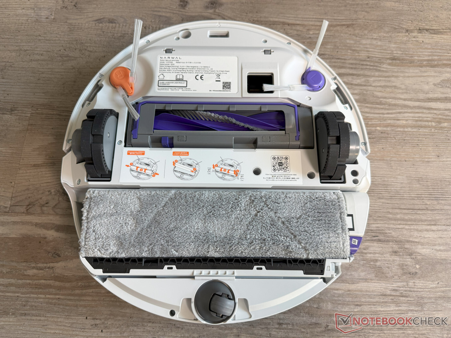 La navegación y la detección de obstáculos se realizan completamente sin torre láser, sino con el sistema autónomo NarMind Pro que utiliza láseres en la parte delantera y trasera, así como dos cámaras RGB y un chip de IA. Según el fabricante, puede superar obstáculos de hasta 4 cm. Con 9,5 cm, la Narwal Flow es ligeramente más plana que la competencia, que también está equipada con un rodillo de fregado, como la Dreame Aqua10 Ultra Rodillo Completo o la Ecovacs Deebot X11 OmniCyclone (1.499 $ en Amazon).