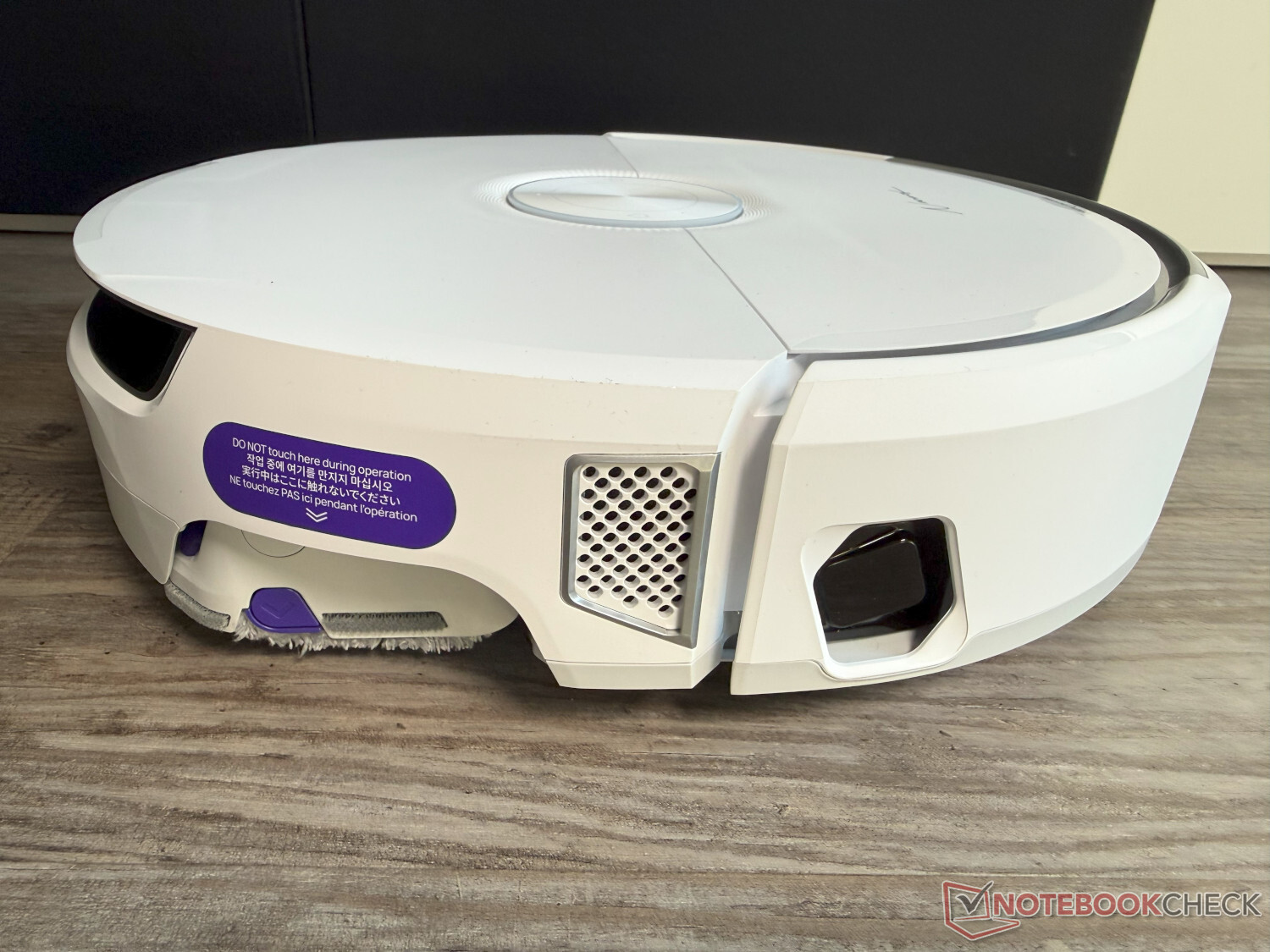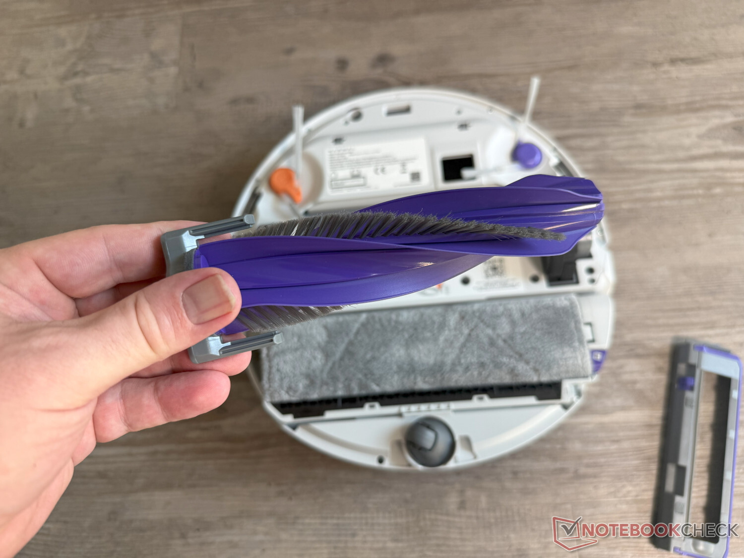 Nos gustó menos que los cepillos laterales siguieran girando en el modo de fregado puro. Además, los cepillos no se pueden levantar, lo que sería especialmente útil en el caso de la detección de líquidos AI, que funcionó bien en la prueba. Esto esparce innecesariamente las manchas húmedas o pegajosas en los alrededores y sobre el aparato. Por desgracia, también observamos que el rodillo, que puede extenderse para fregar casi sin bordes, a veces raspaba a lo largo de puertas, muebles y similares.