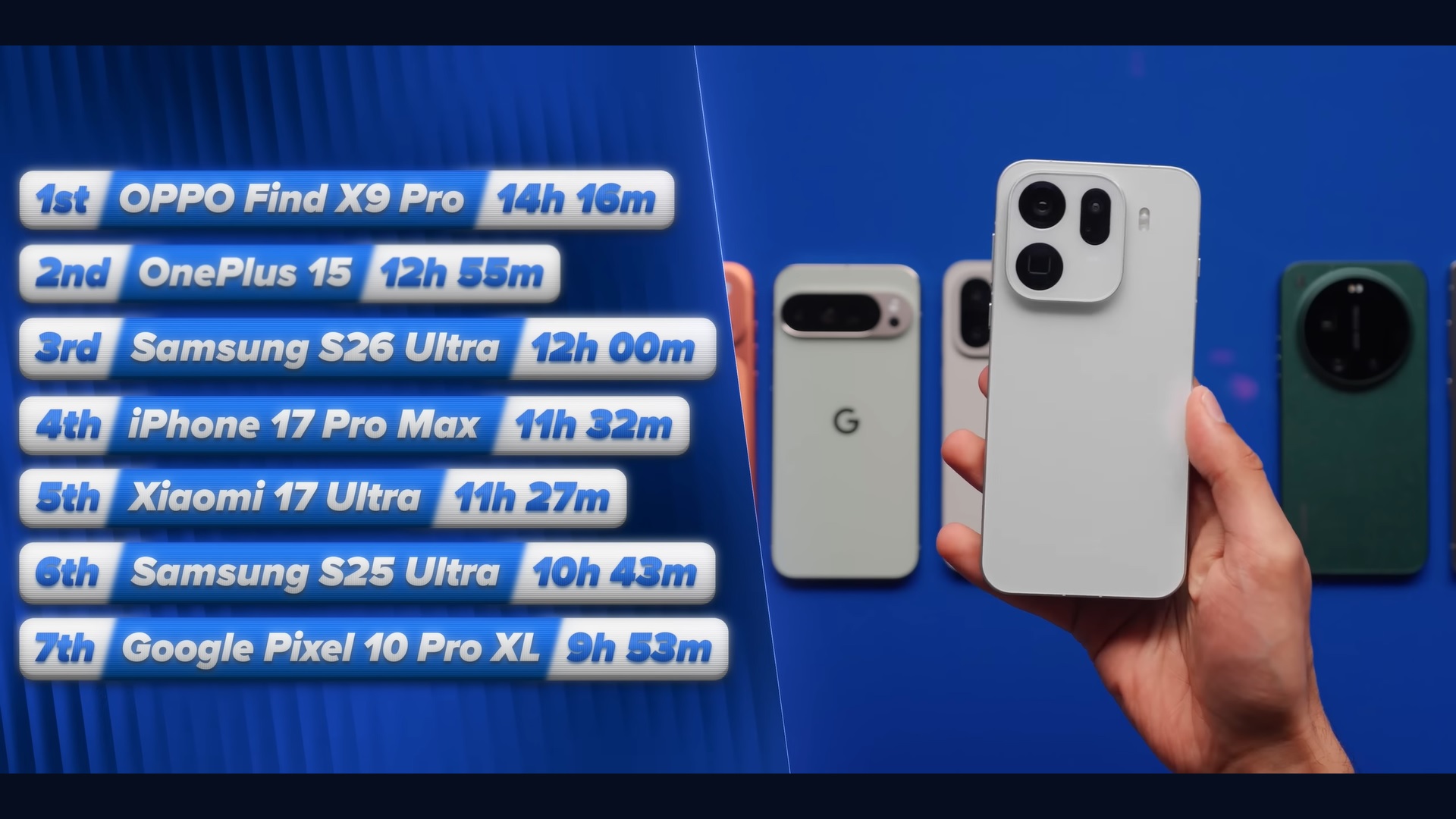 El iPhone 17 Pro Max quedó por detrás del Galaxy S26 Ultra por 28 minutos. El Xiaomi 17 Ultra también presentó una batalla decepcionante con 11 horas y 27 minutos a pesar de llevar una batería de 6.000 mAh. El Galaxy S25 Ultra y el Pixel 10 Pro XL se sientan en la parte inferior de la escalera, registrando sólo 10 horas 43 minutos y 9 horas 53 minutos, respectivamente.