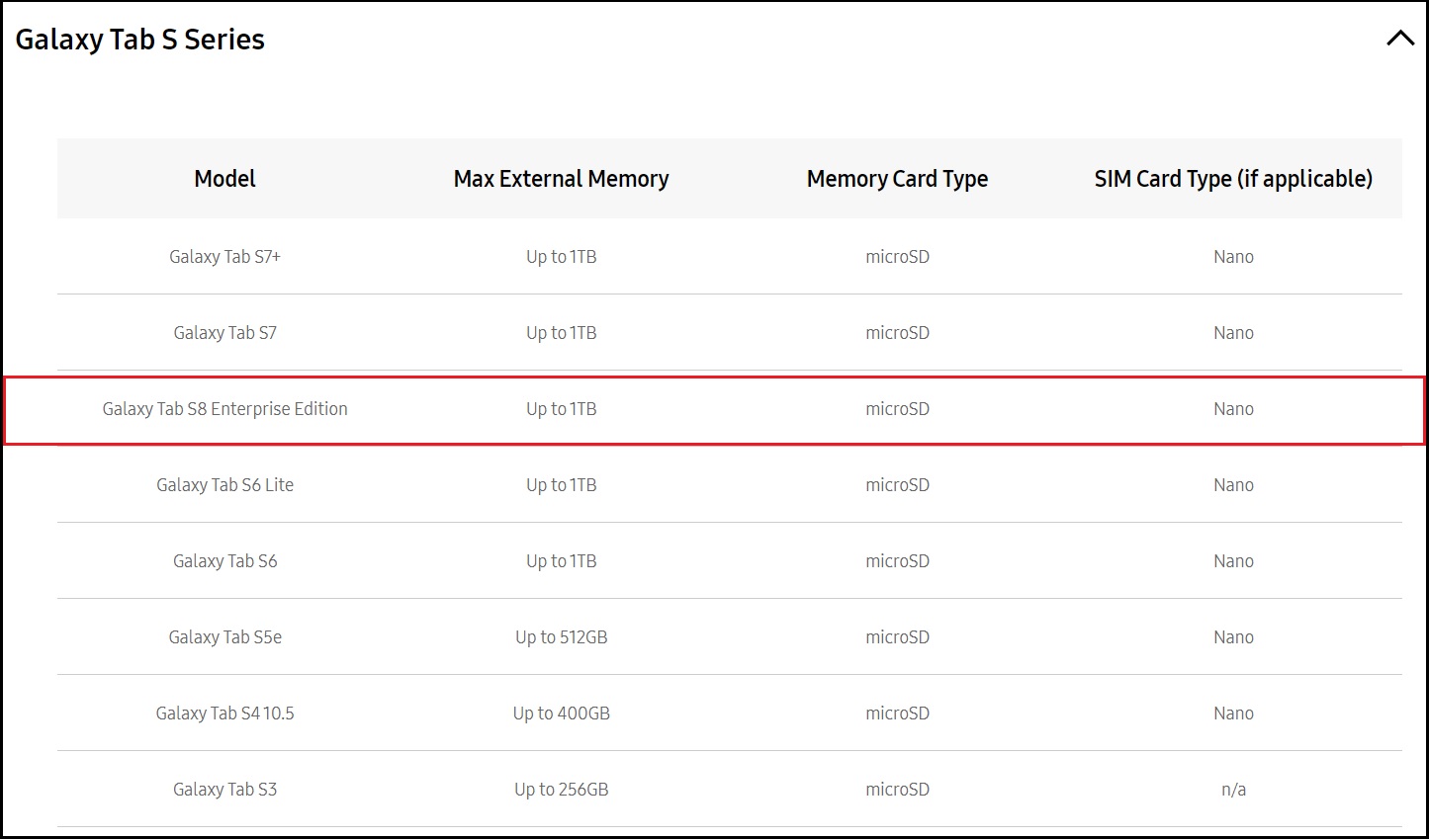 La tableta, que fue vista en las páginas de soporte de Samsung para Irlanda por el sitio rumano androidu.ro, aparece como la Galaxy Tab S8 Enterprise Edition con hasta 1 TB de memoria externa, tipo de memoria microSD y con compatibilidad con tarjetas nano SIM. Los modelos Enterprise Edition de Samsung ofrecen, como es lógico, un mayor apoyo a las empresas, como cuatro años de actualizaciones de firmware, garantía ampliada, mayor seguridad del chip y capacidad de configuración remota.