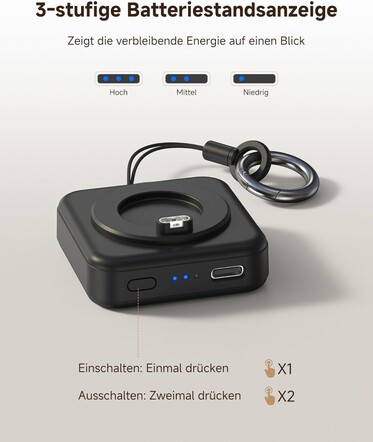 El cargador está diseñado para que resulte práctico llevarlo en un llavero o en una mochila, y para cargar un smartwatch en viajes más cortos sin tener que desenchufar el cargador en casa o buscar un conector USB adecuado cuando se está de viaje. Una vez agotada la batería de 1.200 mAh, puede recargarse mediante un cable USB-C. El cargador mide 5 x 5 x 2 centímetros y pesa 44 gramos.