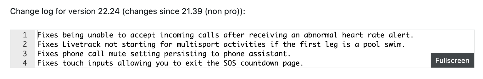 Con la versión beta 22.24, Garmin soluciona un problema relacionado con esta nueva funcionalidad LiveTrack. Se ha resuelto un problema por el que no se iniciaba automáticamente en las actividades multideporte, concretamente en las que comenzaban con un baño en piscina. En esta actualización, la empresa también ha corregido un error que impedía a los usuarios poder aceptar una llamada entrante tras una alerta de frecuencia cardiaca anormal. Además, también se han resuelto los problemas con el ajuste de silenciamiento de llamadas telefónicas y la página de cuenta atrás de SOS.