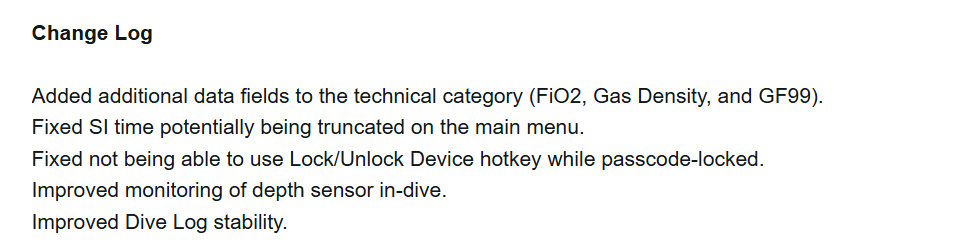 Garmin ha solucionado un problema con el tiempo de intervalo en superficie (SI), que podía truncarse en el menú principal. Además, ha resuelto un problema por el que los usuarios no podían utilizar la tecla de acceso rápido para bloquear o desbloquear el dispositivo mientras estaba bloqueado con un código de acceso. Esta versión también incluye las traducciones de Garmin Connect Mobile versión 2.05, aunque las ventajas de esta actualización no están claras.