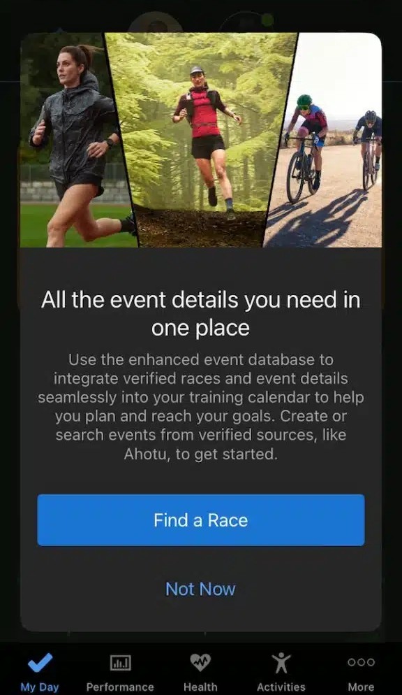 Garmin parece haber actualizado sus funciones de eventos. Una notificación servida a los clientes en la aplicación Garmin Connect, de la que informa Gadgets & Wearablessugiere utilizar la base de datos de eventos mejorada para encontrar más detalles. La herramienta te permite añadir a tu calendario detalles verificados de carreras o eventos, que luego puedes utilizar para ajustar tu régimen de entrenamiento según sea necesario. Por ejemplo, Garmin Race Widget te ayuda a crear un plan de entrenamiento para alcanzar tus objetivos de forma física a tiempo para el evento.