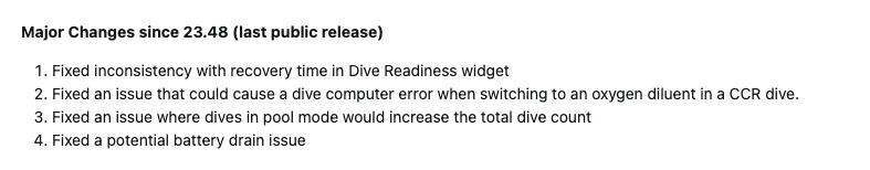 Garmin también ha solucionado un problema con el widget de preparación para la inmersión del Descent G2, por el que el tiempo de recuperación podía ser incoherente. Se han corregido problemas relacionados con las inmersiones registradas en modo piscina, el aumento inesperado del recuento total de inmersiones y un error del ordenador de buceo que se producía cuando el usuario cambiaba a un diluyente de oxígeno para una inmersión CCR.