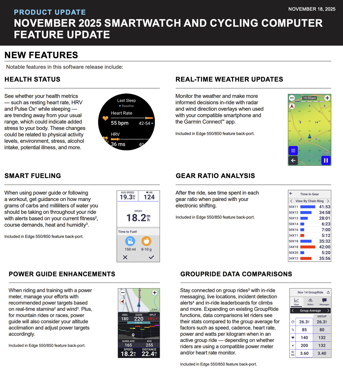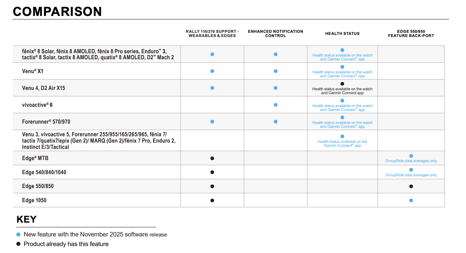 En cuanto al resto de la última actualización de funciones de Garmin, muchas están consignadas a su serie de ciclocomputadores, como el repostaje inteligente y el análisis de la relación de marchas. Dicho esto, Garmin también está ofreciendo un control de notificaciones mejorado en el Fenix 8, Forerunner 970, Venu 4 y Venu X1, entre otros smartwatches asociados. Además, Garmin también ha añadido compatibilidad con Rally 110 y Rally 210 para numerosos wearables con la actualización de funciones de noviembre de 2025, como muestra la imagen superior.