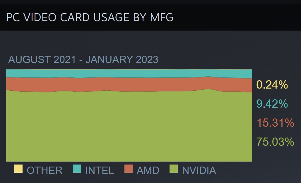 Como siempre, Nvidia domina por completo la tabla de uso de tarjetas de vídeo para PC que se elabora en la encuesta mensual de hardware y software de Steam. Para enero de 2023, el equipo verde aparentemente ha conseguido https://store.steampowered.com/hwsurvey/ 75.03% de la cuota de usuarios, dejando sólo un 15,31% para AMD y un 9,42% para Intel. Nvidia también mantiene un poderoso control sobre la tabla general de porcentaje de uso de tarjetas gráficas y la tabla de porcentaje de cambio mensual, con la preciada GeForce RTX 4090 que proporciona a la compañía otra entrada fuerte.