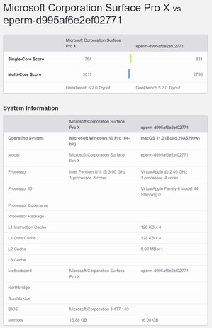 Sin embargo, no es exactamente una comparación entre iguales, ya que el MacBook Air de Ice Lake-Y es una máquina x86. En su lugar, algunas personas han tratado de comparar el DTK con un Surface Pro X, otra máquina con un chipset basado en ARM. Microsoft utiliza el SQ1 en el Surface Pro X, que se fabrica en un proceso de 7 nm y tiene ocho núcleos como el A12Z Bionic. Estos ocho núcleos están divididos uniformemente en clusters de rendimiento y ahorro de energía en ambos chips, aunque los del SQ1 pueden alcanzar mayores velocidades de reloj. El SQ1 también tiene un TDP más bajo y menos unidades de ejecución de GPU que el A12Z Bionic, aunque con un rendimiento considerablemente más alto del FP32 en coma flotante.