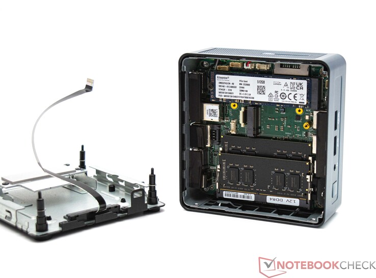 Si desea acceder a los componentes internos del aparato, primero debe retirar la placa base. Se trata de un proceso sencillo: los tornillos que sujetan la cubierta a la carcasa se encuentran debajo de las cuatro patas de goma. Una vez retirada, podrá acceder fácilmente a los componentes instalados, como la memoria RAM, la unidad SSD o el módulo WLAN. El Geekom Mini IT12 también cuenta con una ranura M.2 adicional para instalar un dispositivo de almacenamiento masivo adicional. Además, tiene espacio para alojar un dispositivo de almacenamiento masivo de 2,5 pulgadas. El dispositivo puede desmontarse aún más si es necesario, lo que permite limpiar los ventiladores o aplicar pasta térmica nueva.