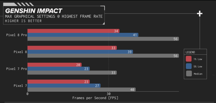 Sin embargo, otros revisores, como Dave2D y Linus Tech Tips, obtuvieron resultados notablemente mejores con el Pixel 8 Pro en Genshin Impact. El primero registró una media de FPS de 56, con un mínimo del 1% de 34, mientras que la cifra del segundo ronda la marca de los 55 FPS. Uno no puede evitar preguntarse qué causó una discrepancia tan masiva en las puntuaciones aparte de la metodología de prueba y una compilación de software diferente. Genshin Impact no tiene una herramienta de evaluación comparativa incorporada, por lo que no hay una forma "estándar" de probarlo.