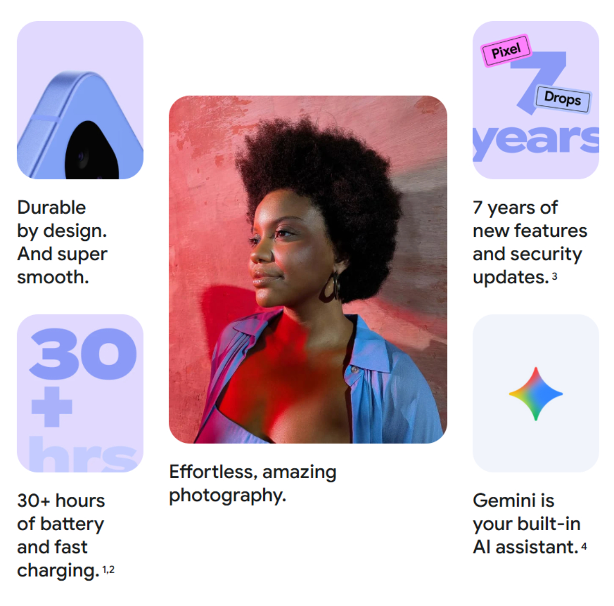 De alguna manera, el Pixel 10a es 3 g más ligero que su predecesor con 183 g. Además, Google ha subido la serie Pixel A a Corning Gorilla Glass 7i desde el Gorilla Glass 3 utilizado en el Pixel 9a. Por otra parte, los valores de brillo han saltado un 11% a 2.000 nits (100% APL) y 3.000 nits (5% APL). El Pixel 10a ha ganado las funciones de la cámara Camera Coach, Macro Focus y Auto Best Take que el Pixel 9a también carece.