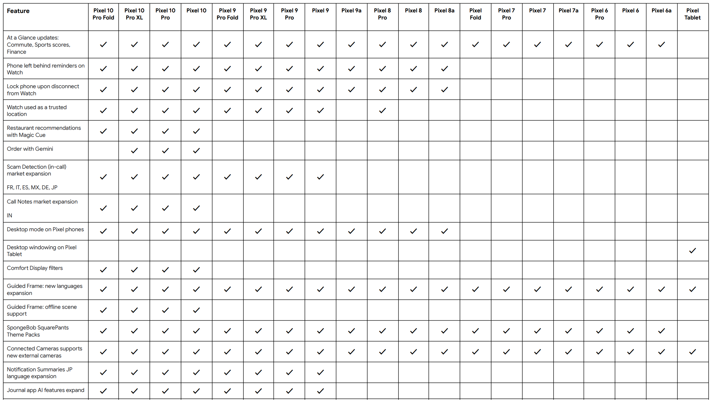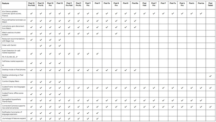 Por cierto, la ventana de escritorio ahora también ha llegado a la tableta Pixel. Además, Google ha ampliado la detección de estafas en llamadas a Alemania, Francia, Italia, Japón, México y España. Consulte la siguiente tabla para obtener más detalles sobre qué nuevas funciones llegarán a qué dispositivos a finales de este mes.