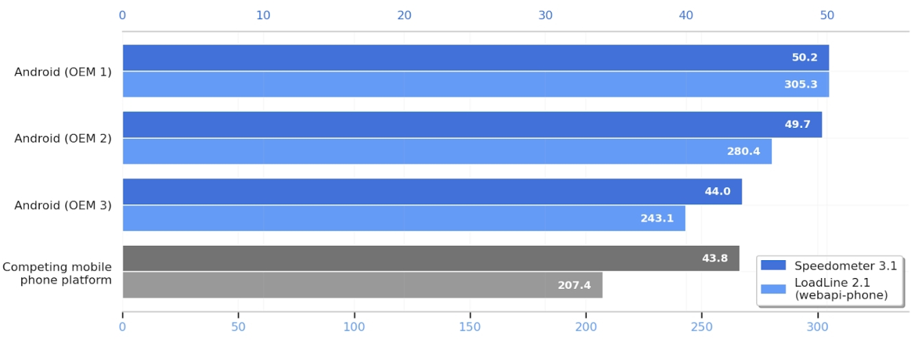 Speedometer es un proyecto conjunto de Apple, Google y Mozilla, y simula tareas comunes del usuario como pulsar botones para navegar y desplazarse para medir lo "ágil" que se siente un navegador. Los resultados del benchmark compartidos por Google muestran que los teléfonos insignia no identificados de Android superan a los últimos teléfonos de una "plataforma de telefonía móvil de la competencia" (léase: iOS).