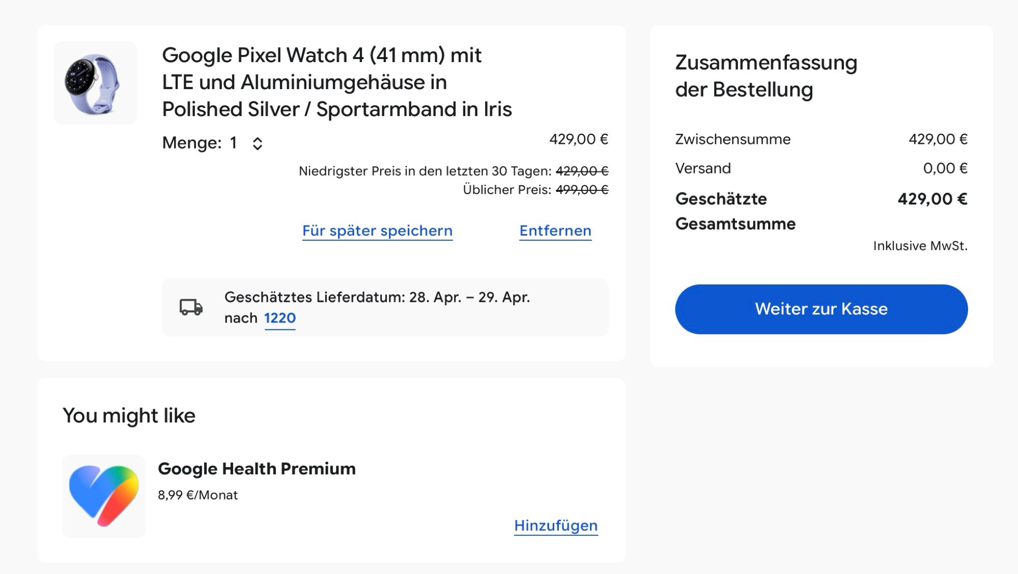 Si actualmente añade un Pixel Watch 4 a la cesta de la compra en la tienda en línea de Google, Google está recomendando esta nueva suscripción "Google Health Premium" a un precio de 8,99 euros al mes. Como 9to5Google descubrió, la suscripción ya aparece en la aplicación Fitbit, ya sea por 9,99 $ al mes o por 99,99 $ al año. Por tanto, la suscripción anual cuesta 20 dólares más que Fitbit Premium. Aún no se sabe si Google Health Premium pretende ser un complemento o un sustituto de Fitbit Premium.