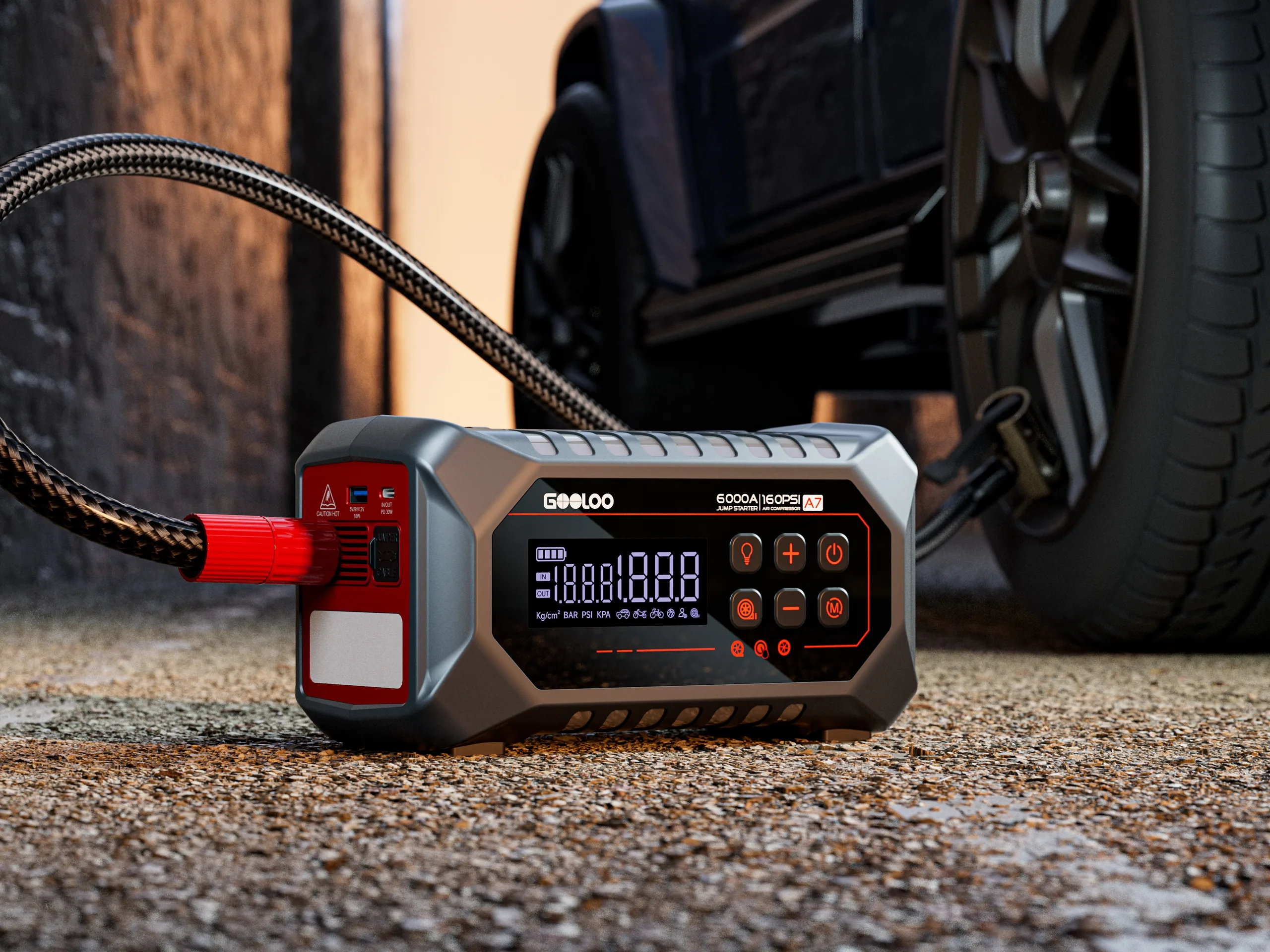 Gooloo, fabricante de accesorios para automóviles, ha lanzado al mercado mundial su último arrancador portátil A7. El artilugio portátil, diseñado para ser utilizado por aventureros al aire libre, conductores y entusiastas del bricolaje, se anuncia como un accesorio multifuncional 3 en 1. En cuanto a sus dimensiones, el A7 mide 5,91 x 4,92 x 10,55 pulgadas (150,1 x 124,9 x 267,9 mm) y pesa alrededor de 31 libras (14,06 kg).