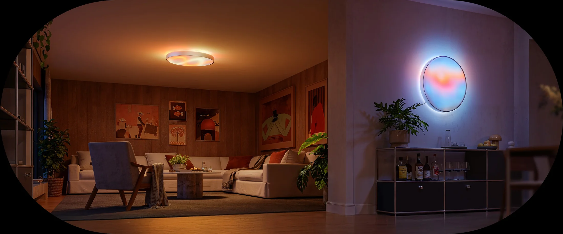 La nueva lámpara de techo Ultra es esencialmente una evolución del conocido modelo del fabricante. Incorpora una matriz de píxeles formada por 616 LED individuales, que pueden proyectar efectos de iluminación personalizados en el techo o la pared. Cada píxel individual puede controlarse por separado para mostrar pixel art y una amplia gama de motivos, por ejemplo, con el apoyo de AI Lighting Bot 2.0 para contenidos personalizados basados en texto y otras entradas. También hay disponibles unas 100 escenas preestablecidas y modos de música.