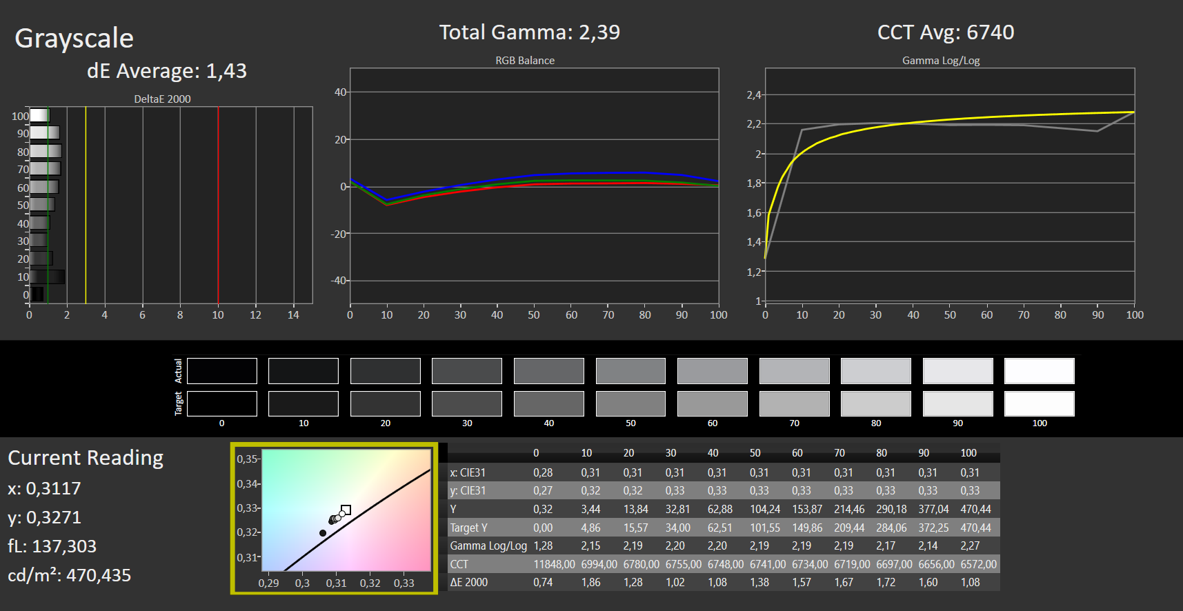 ΔE Greyscale Calman: 1.3 | ∀{0.09-98 Ø5}