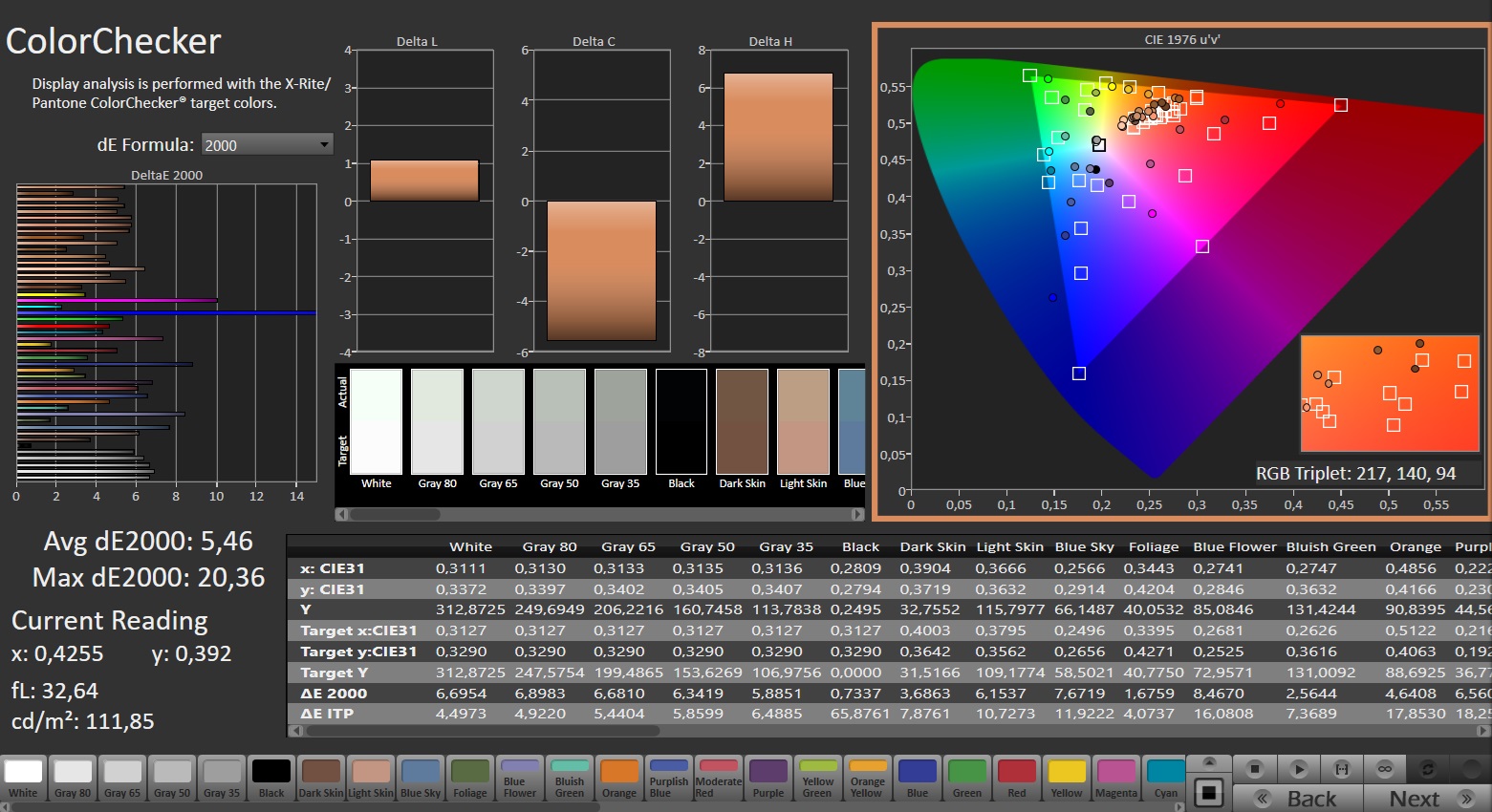 | Colorchecker dE 2000 * | 5.46 | 5.21 5% | 3.04 44% | 1.2 78% | 1.79 67% |