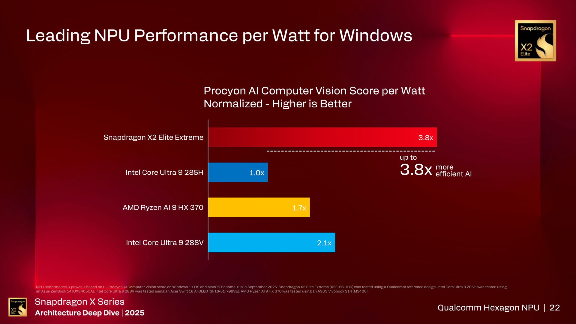 Qualcomm presenta la NPU Hexagon 6 del Snapdragon X2 Elite Extreme como la más rápida del mundo, con hasta 5,7 veces más rendimiento y 3,8 veces más eficiencia en comparación con el Core Ultra 9 285H's NPU en Procyon AI Computer Vision.