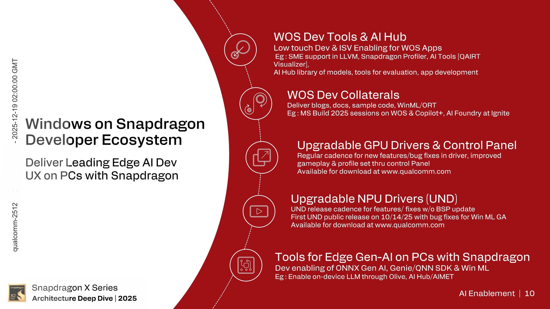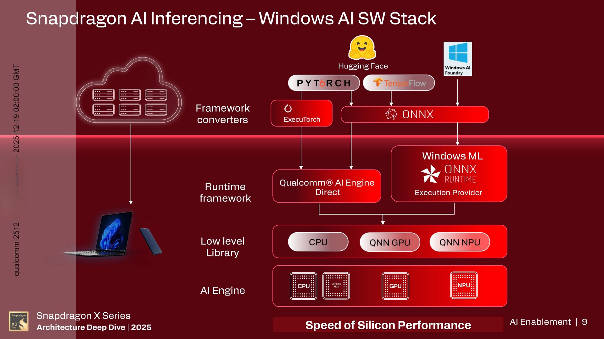 Qualcomm afirma que la inferencia de IA de Snapdragon funciona con la pila de software de IA de Windows para permitir cargas de trabajo agénticas de próxima generación. Los marcos abiertos de ML compatibles incluyen PyTorch y TensorFlow.