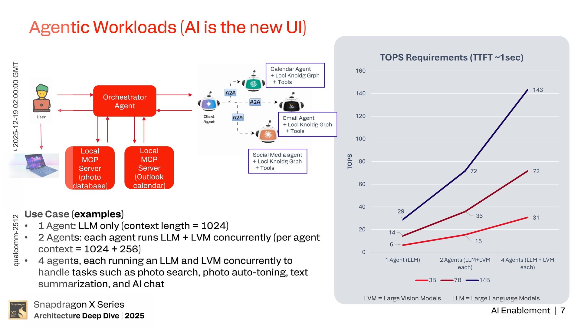 Qualcomm destacó cómo un único agente LLM con una longitud de contexto de 1024 y 14.000 millones de parámetros (14B) requeriría hasta 143 TOPS de potencia de procesamiento de IA, mientras que los casos de uso de agentes con dos (3B) o cuatro agentes (7B), cada uno ejecutando un LLM y un LVM simultáneamente, pueden requerir hasta 72 TOPS.