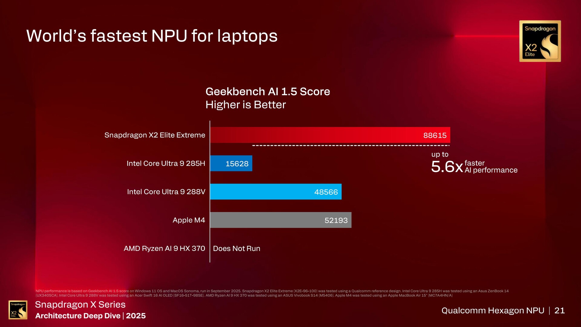 Geekbench AI considera que la NPU Hexagon 6 es casi un 70% más rápida que la NPU del Apple M4 mientras que aventaja a la Core Ultra 9 288V en un 82,4%.